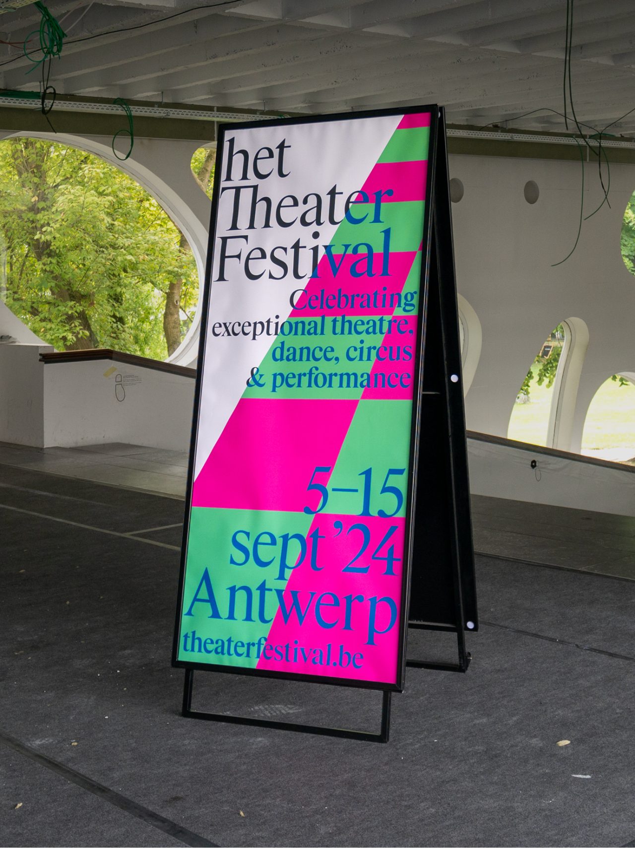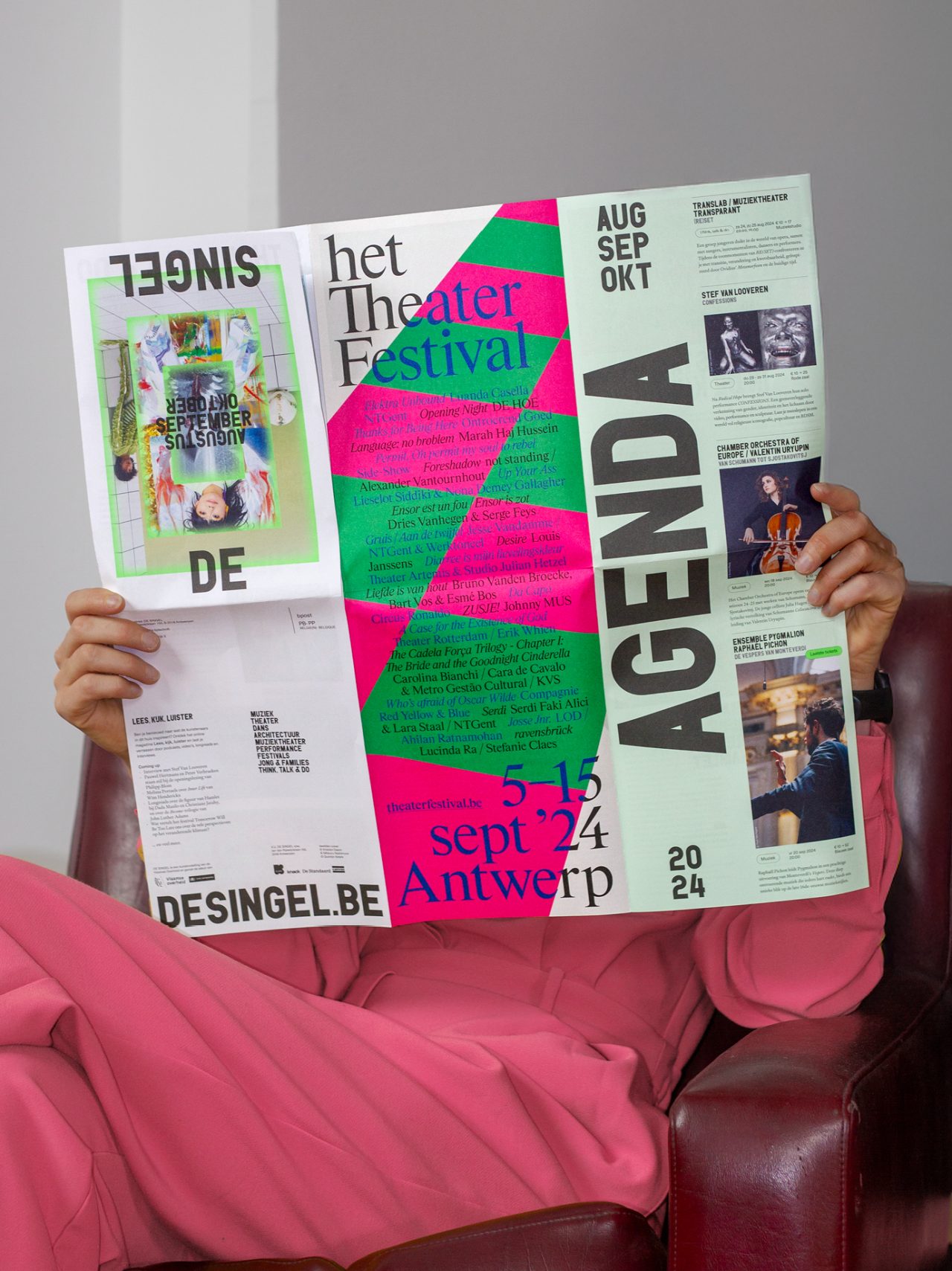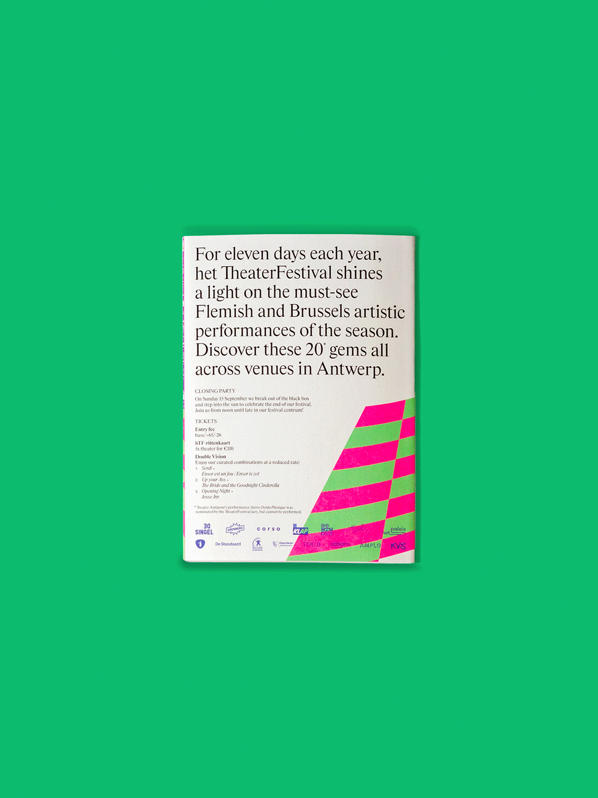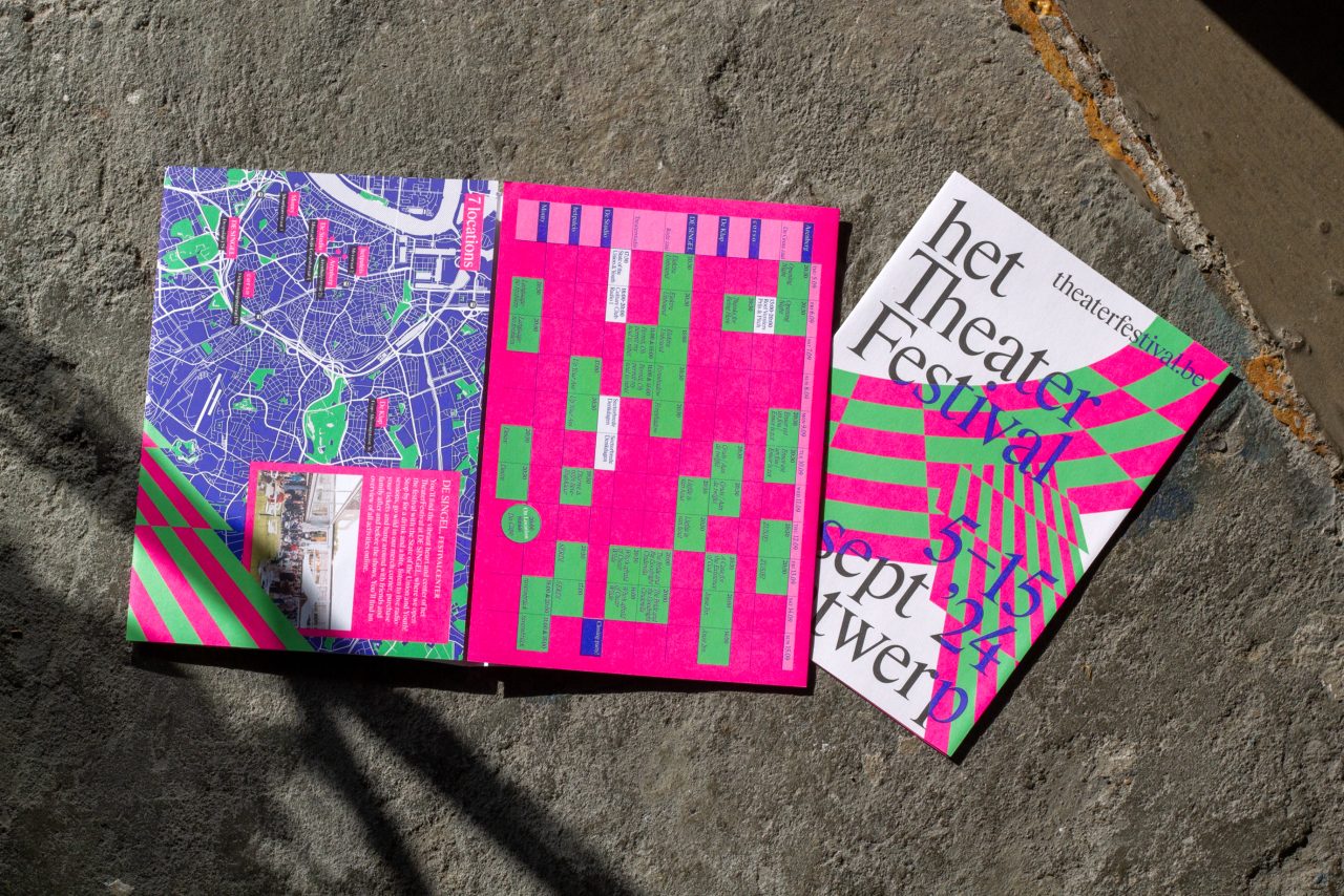Het TheaterFestival is a prominent and nomadic celebration of exceptional theater, dance, circus, and performance. In 2024, the festival settled in Antwerp, where it spent 11 days showcasing the unique and vibrant theater scene of Flanders and beyond. Centered at DE SINGEL and extending to several partner venues across the city, the festival provided an energetic launch to the new performing arts season. The program included a festive opening, workshops, jury selections, and a showcase of some of the past season’s most intriguing works. This year, our studio had the opportunity to (re)brand the festival for the first time. We embraced bright colors and dynamic patterns to evoke the excitement of a stage, offering a fresh perspective and capturing the layered nature of performances.
