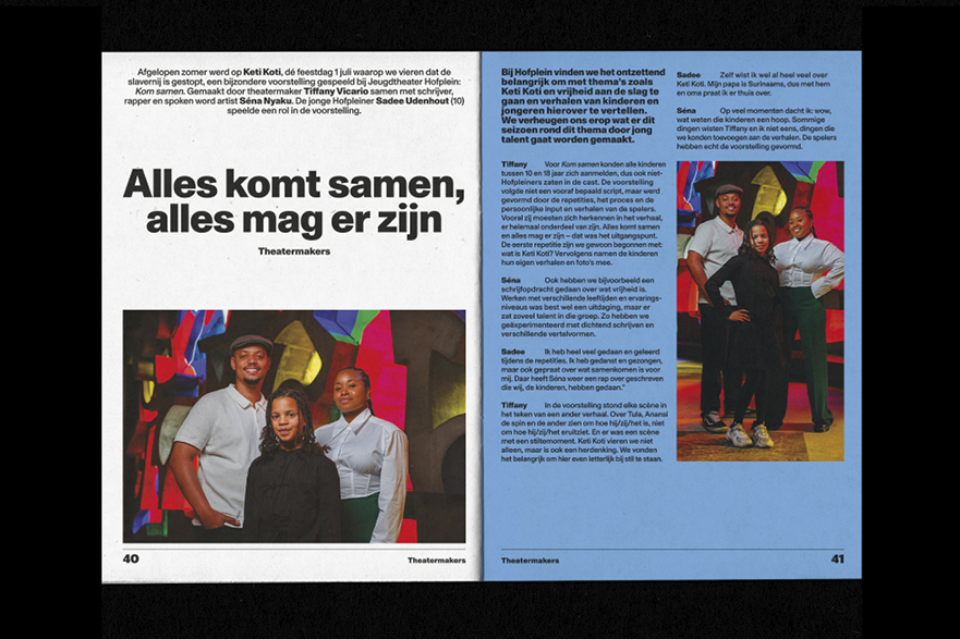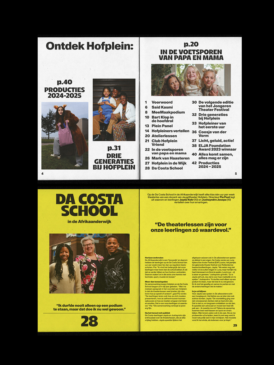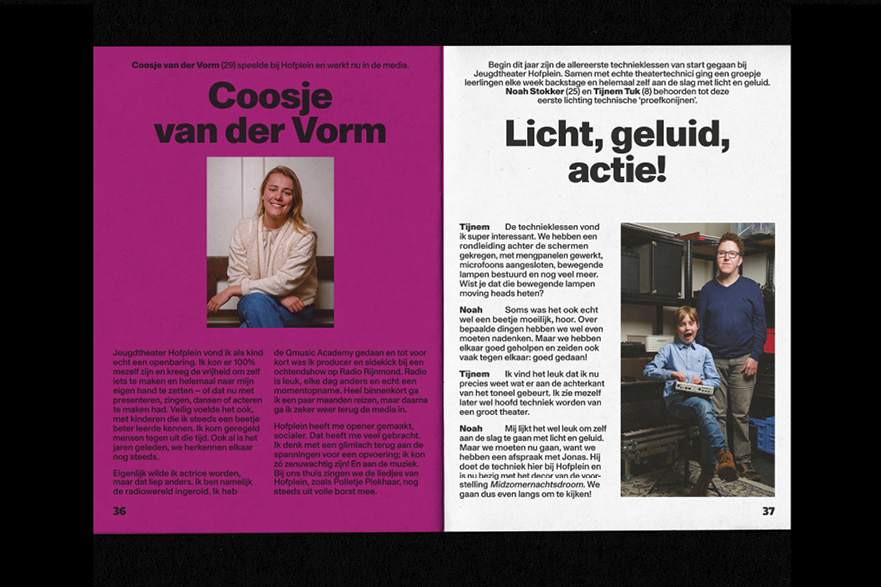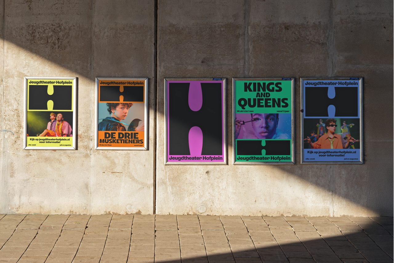 Jeugdtheater Hofplein has been a household name in Rotterdam and a home to over 100,000 young theater-makers and enthusiasts for nearly 40 years. Today, 11,500 children attend Jeugdtheater Hofplein yearly, participating in courses, workshops and performances. Hofplein has always dared to be different—bold, contemporary, and ever-evolving. With their fresh perspective on youth theater – they needed a new look to match. But how do you express such a vibrant community in a visual identity? Our concept was to create an identity as dynamic and playful as the Hofplein community itself.