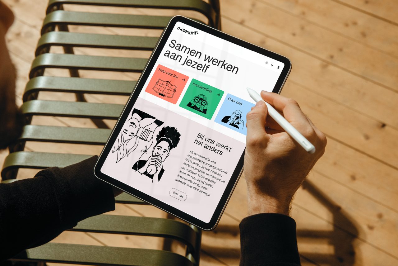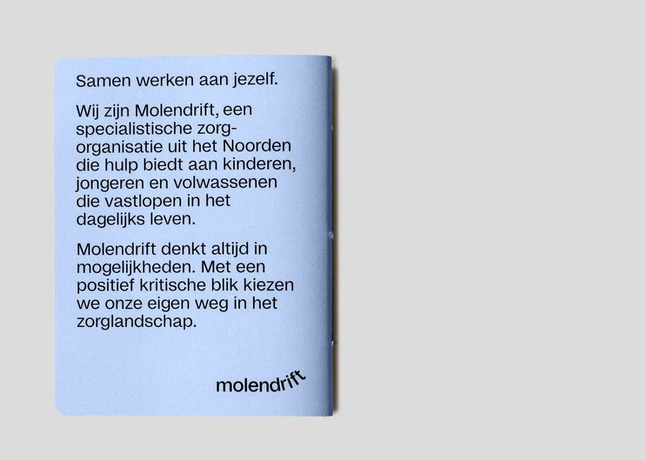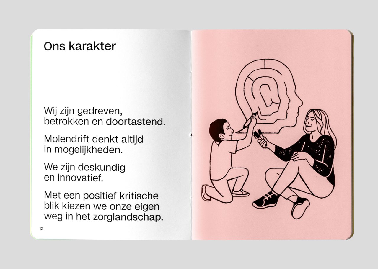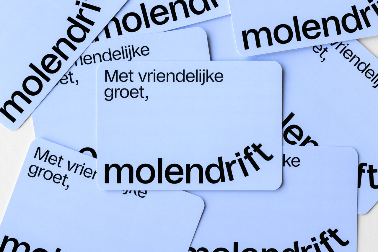 As part of the rebranding venture, we collaborated with illustrator Megan Devos to bring Molendrift’s vision to life through charming illustrations. The dynamic web development for the organisation was skilfully executed by Slash2, ensuring a seamless online experience for Molendrift’s audience. The visual narrative of Molendrift is further enriched by photographer Marleen Annema, capturing the essence of the organisation’s mission and the individuals it serves. Molendrift embraces the distinct typeface Studio6, curated by Playtype, lending a unique and memorable touch to the brand’s visual identity.