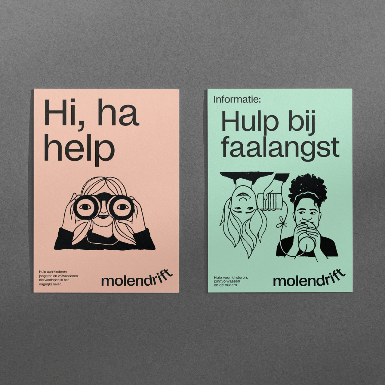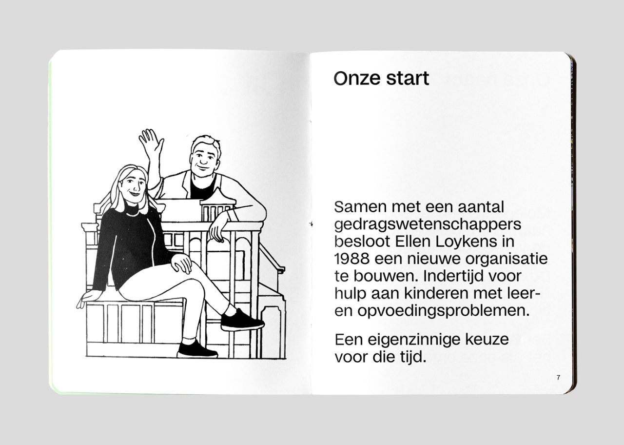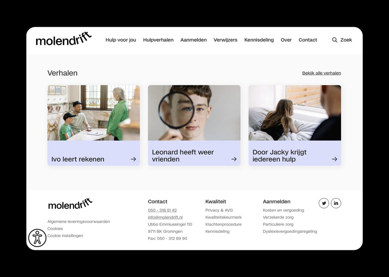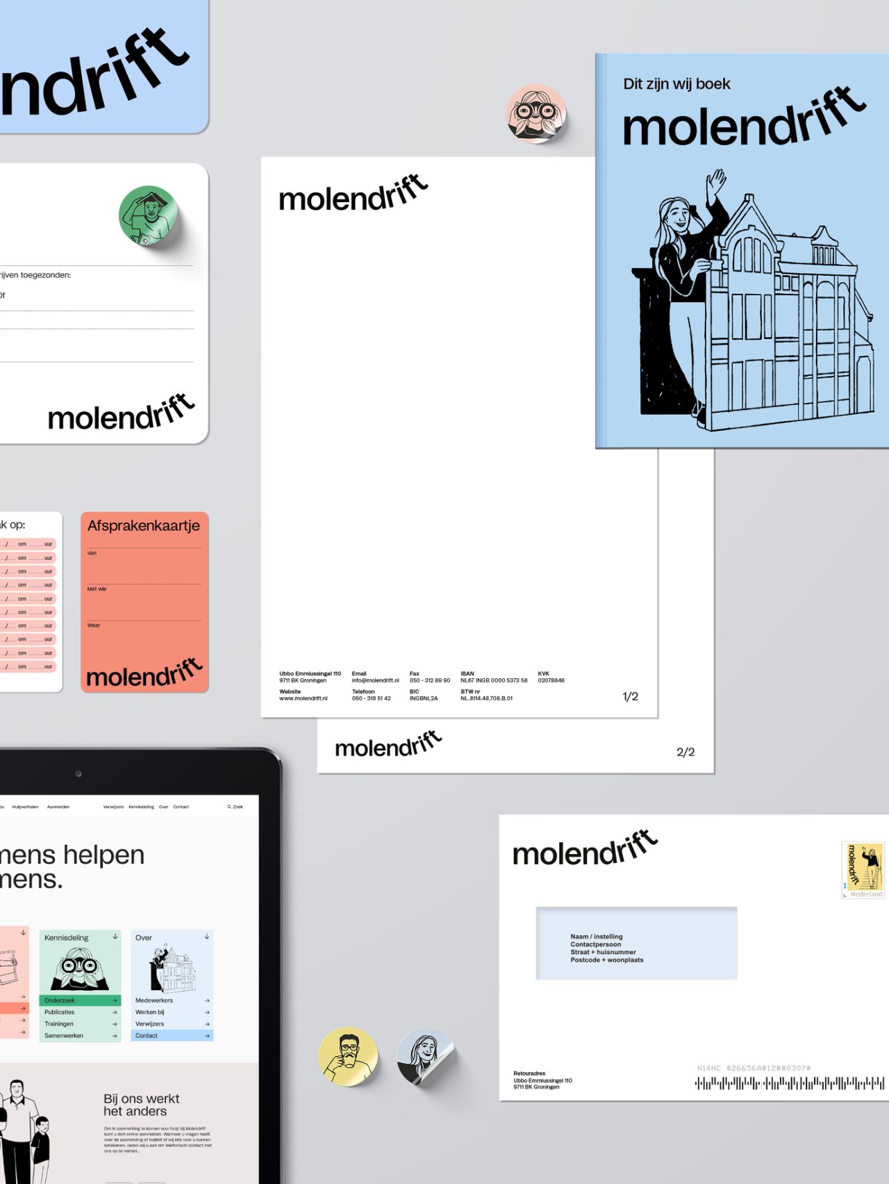 As part of the rebranding venture, we collaborated with illustrator Megan Devos to bring Molendrift’s vision to life through charming illustrations. The dynamic web development for the organisation was skilfully executed by Slash2, ensuring a seamless online experience for Molendrift’s audience. The visual narrative of Molendrift is further enriched by photographer Marleen Annema, capturing the essence of the organisation’s mission and the individuals it serves. Molendrift embraces the distinct typeface Studio6, curated by Playtype, lending a unique and memorable touch to the brand’s visual identity.
