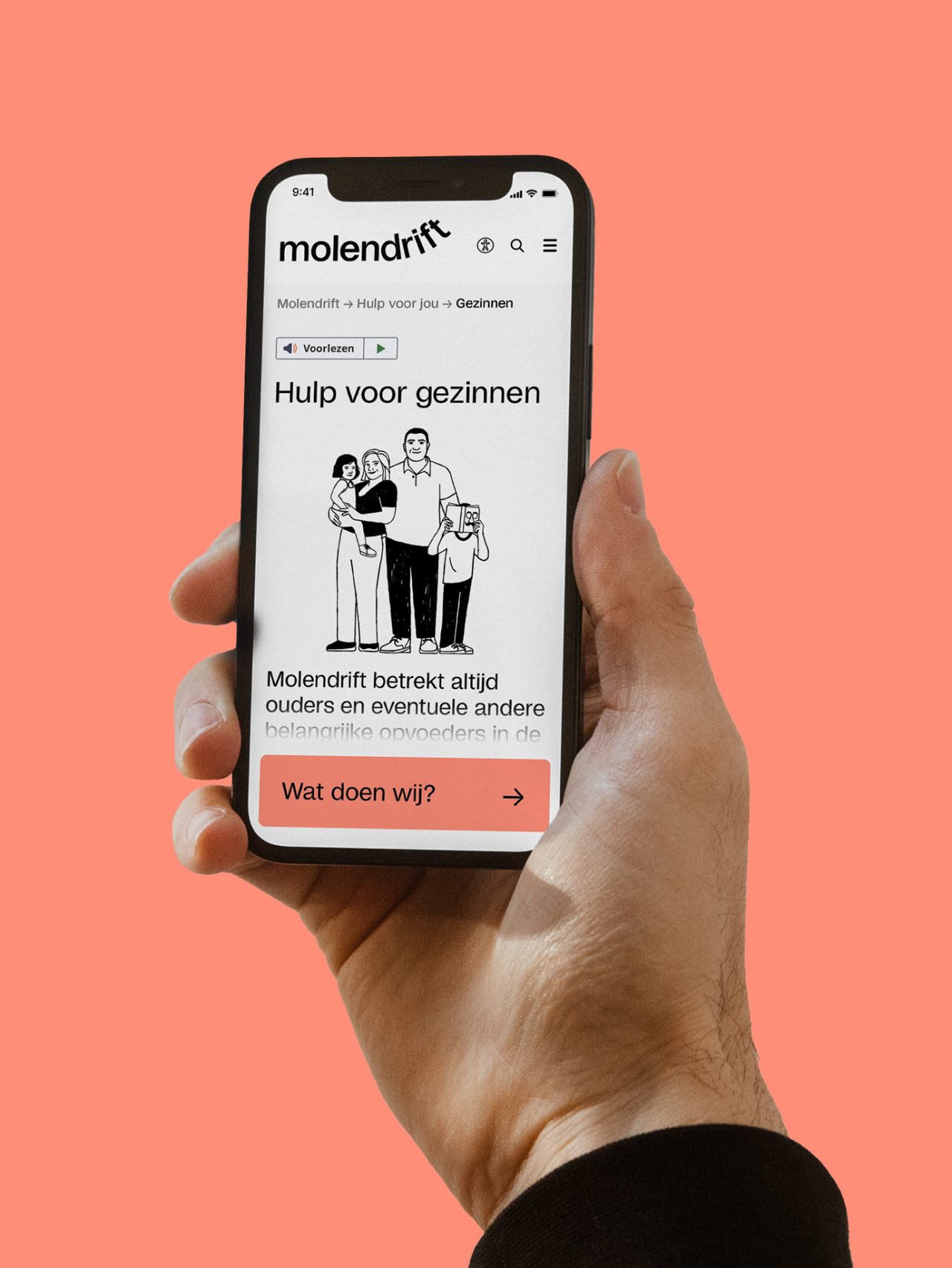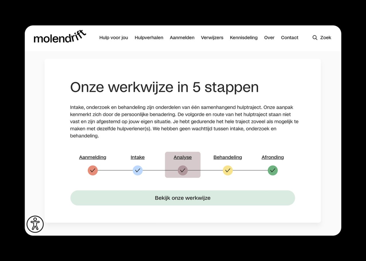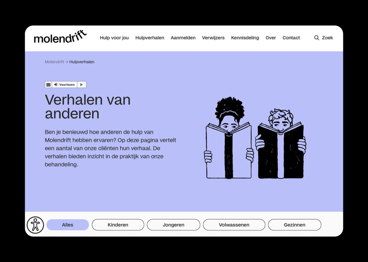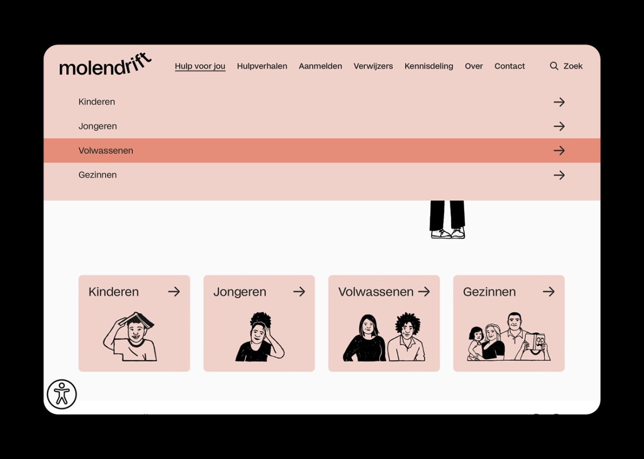 As part of the rebranding venture, we collaborated with illustrator Megan Devos to bring Molendrift’s vision to life through charming illustrations. The dynamic web development for the organisation was skilfully executed by Slash2, ensuring a seamless online experience for Molendrift’s audience. The visual narrative of Molendrift is further enriched by photographer Marleen Annema, capturing the essence of the organisation’s mission and the individuals it serves. Molendrift embraces the distinct typeface Studio6, curated by Playtype, lending a unique and memorable touch to the brand’s visual identity.
