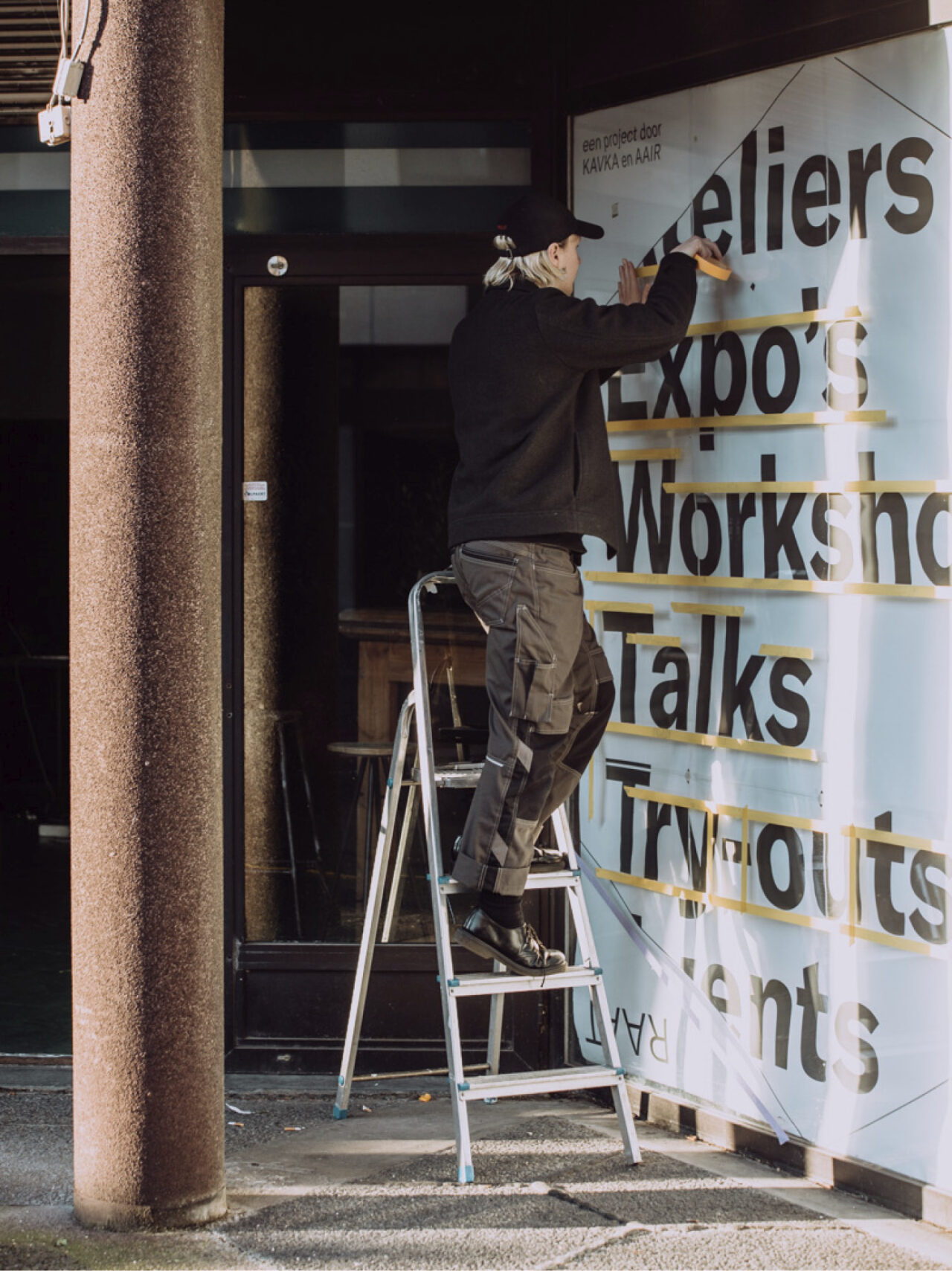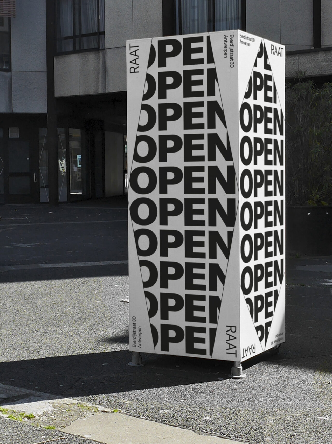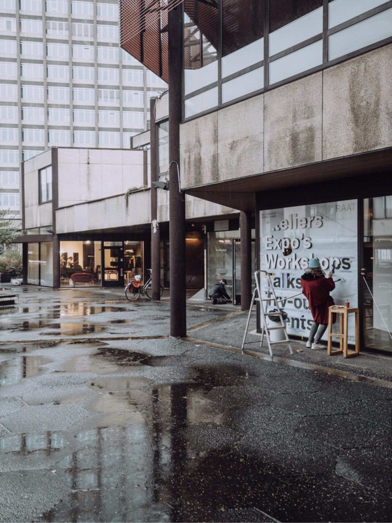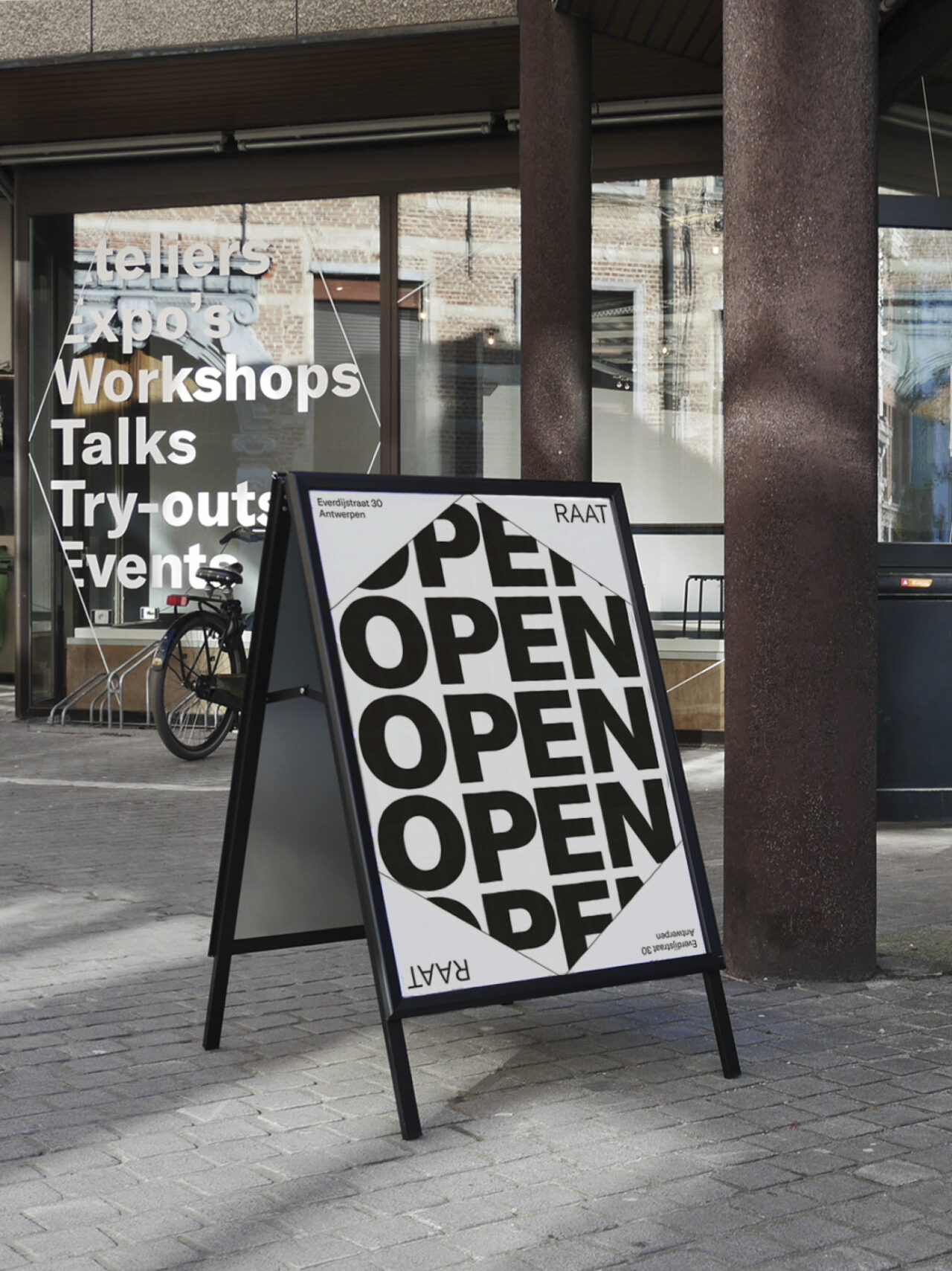 For RAAT’s identity, our studio created a framework for local creatives to give their own (typographic) interpretation. For both the identity, social media and the decoration of the location, we were inspired by the hexagon that is so characteristic of the building. To further accentuate the special building, we transformed every square into a hexagon. Playing with the subtle lines provides space for the young artists to display their work in the residual space. By applying the design system to the windows, we show that something is going on again after the vacancy. In short, a design that fits seamlessly with their program: RAAT facilitates the place, and the residents bring it to life!