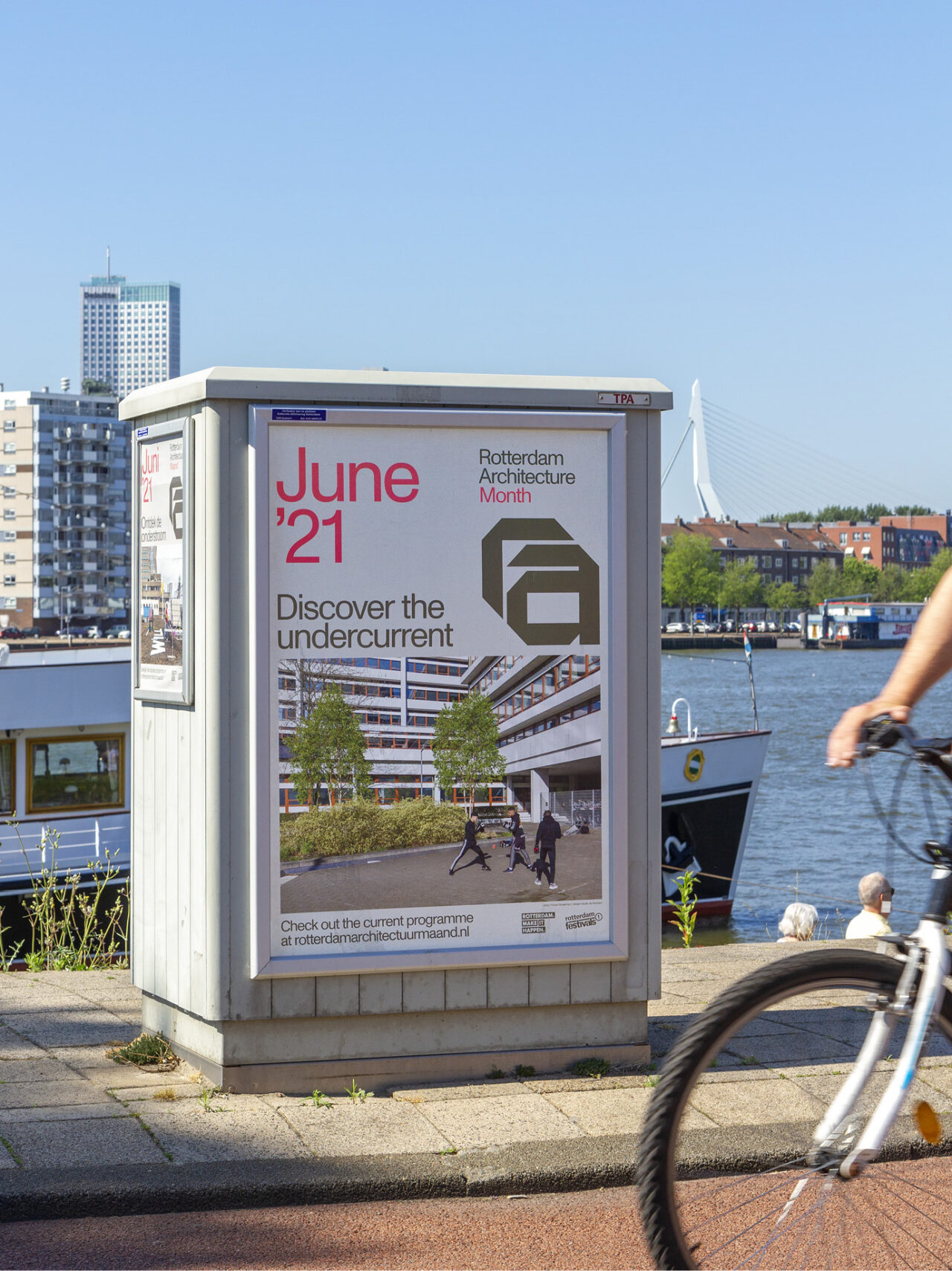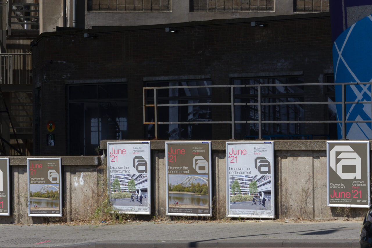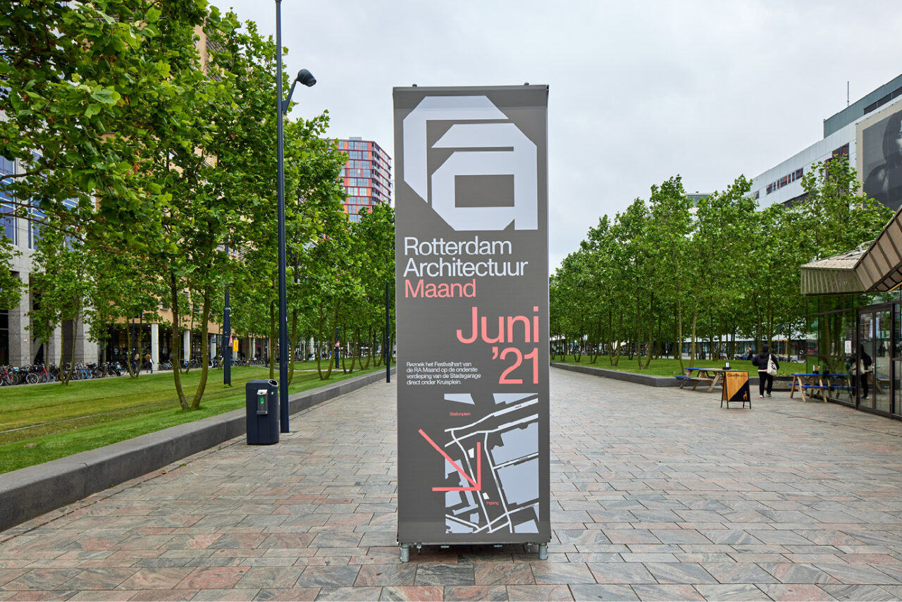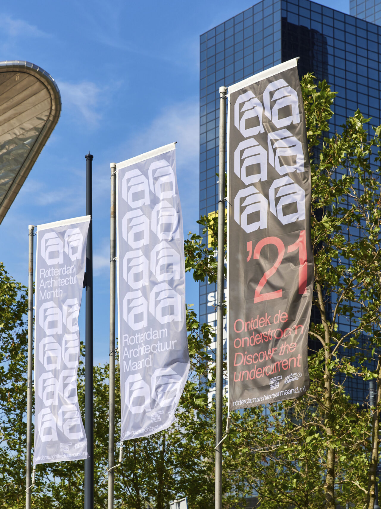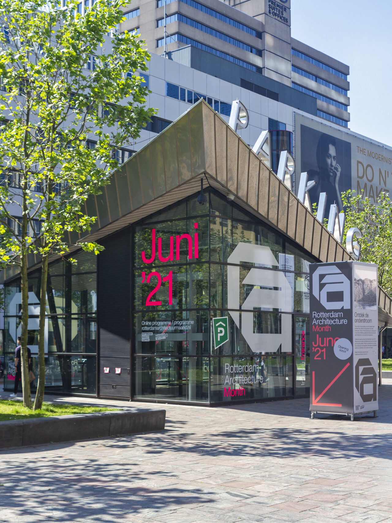 Our studio developed the identity, website, the campaign, and the exhibitions’ signing/wayfinding. The intervention was designed by architect Enzo Valerio. Amongst others, the partners of this edition include the Municipality of Rotterdam, Rotterdam Rooftop Days, OMI, universities and many design bureaus.