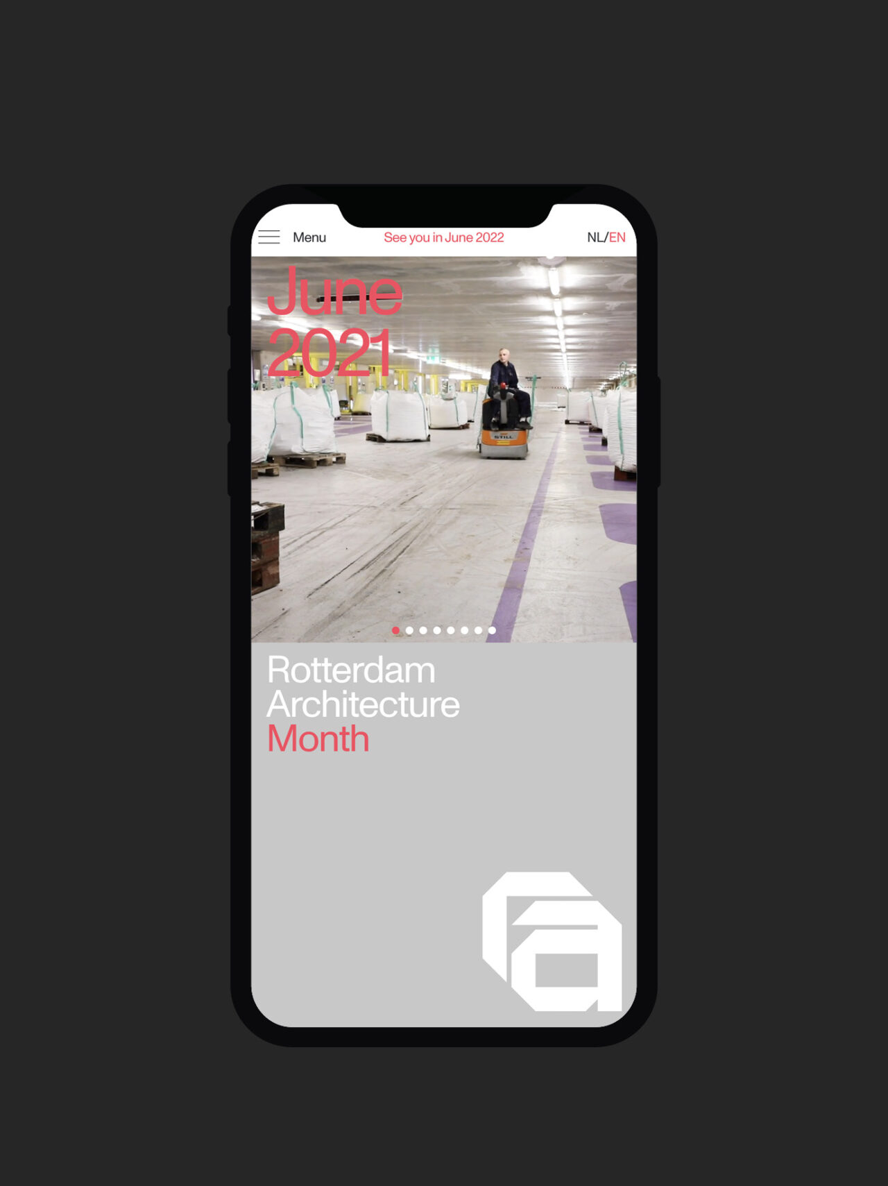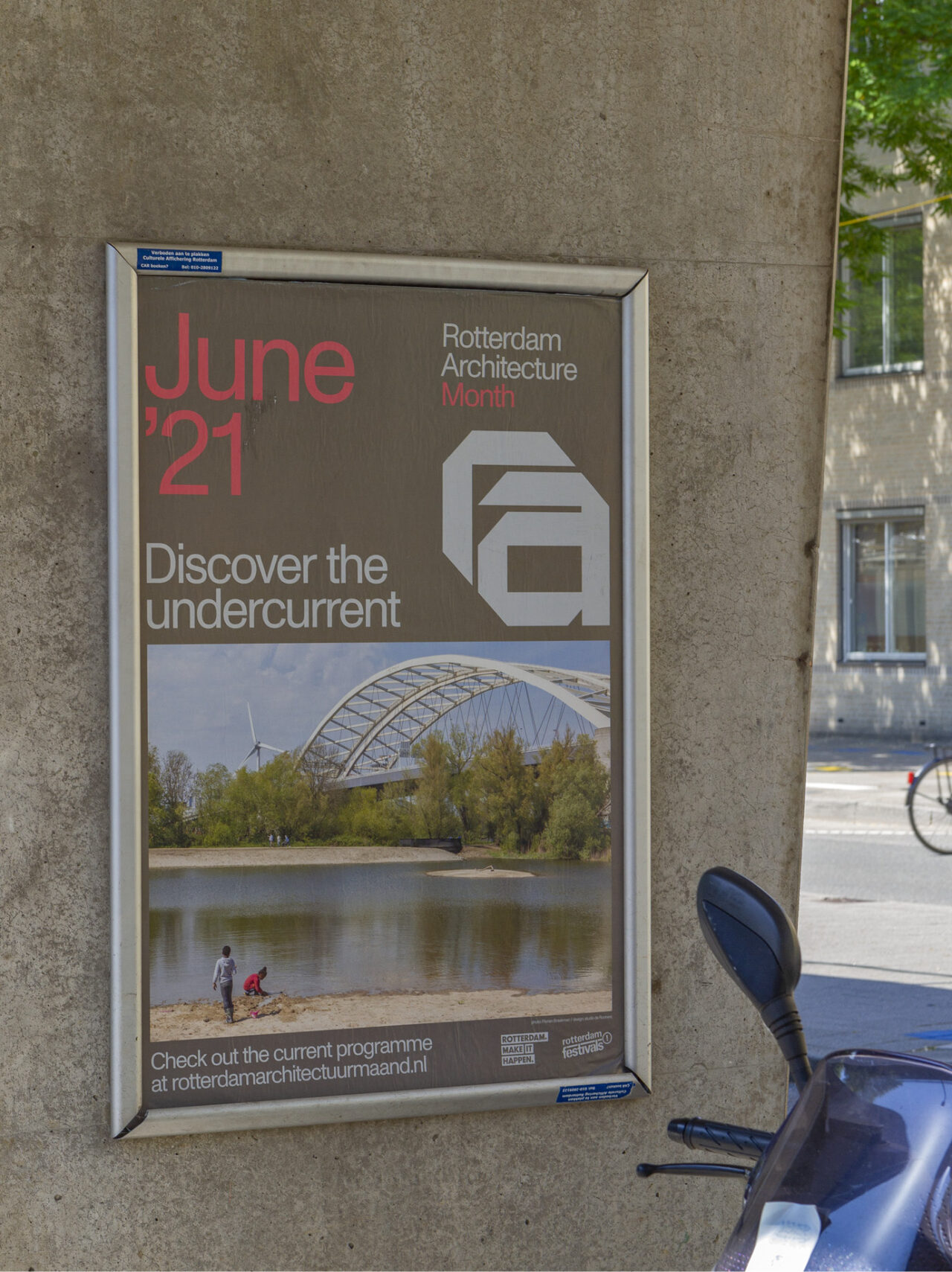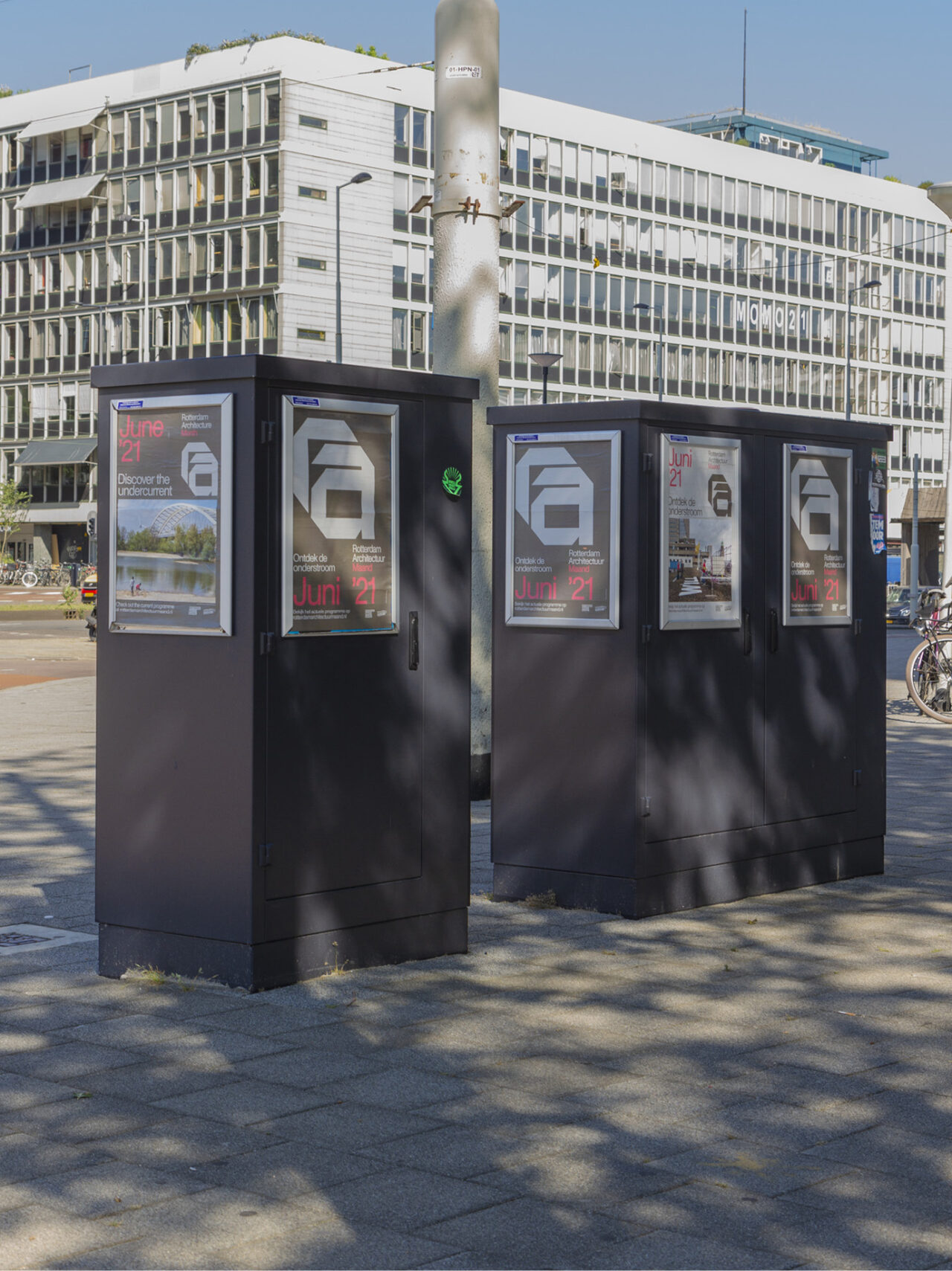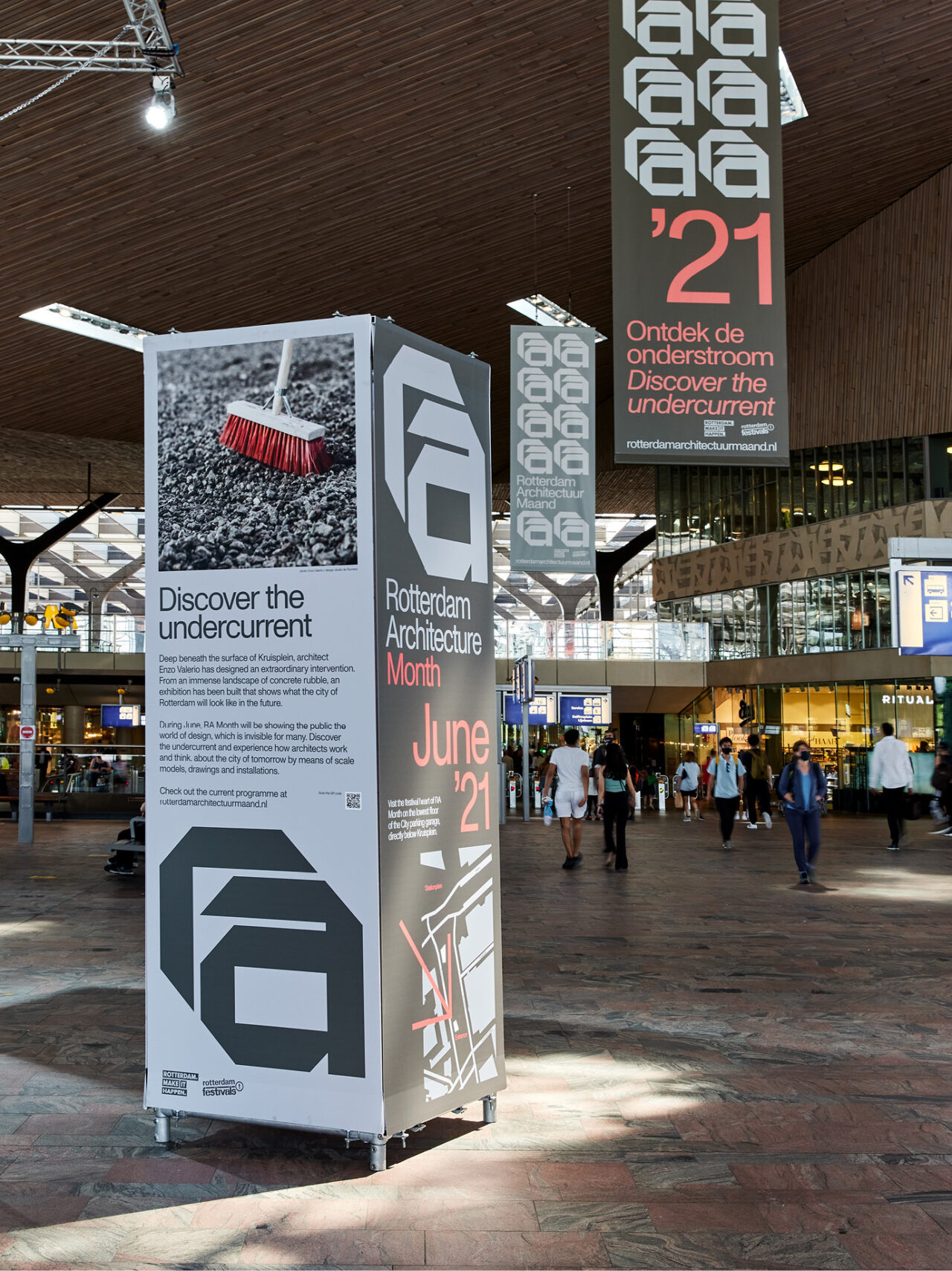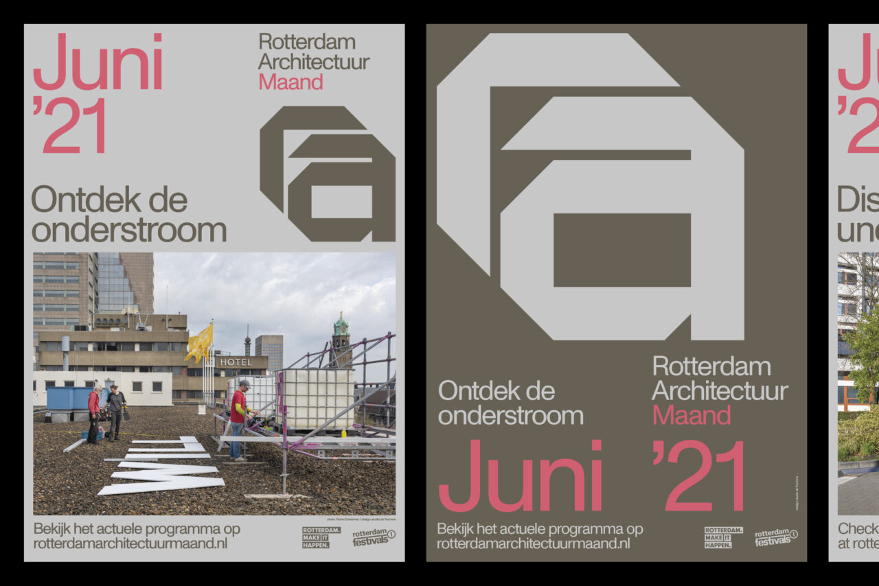 Our studio developed the identity, website, the campaign, and the exhibitions’ signing/wayfinding. The intervention was designed by architect Enzo Valerio. Amongst others, the partners of this edition include the Municipality of Rotterdam, Rotterdam Rooftop Days, OMI, universities and many design bureaus.