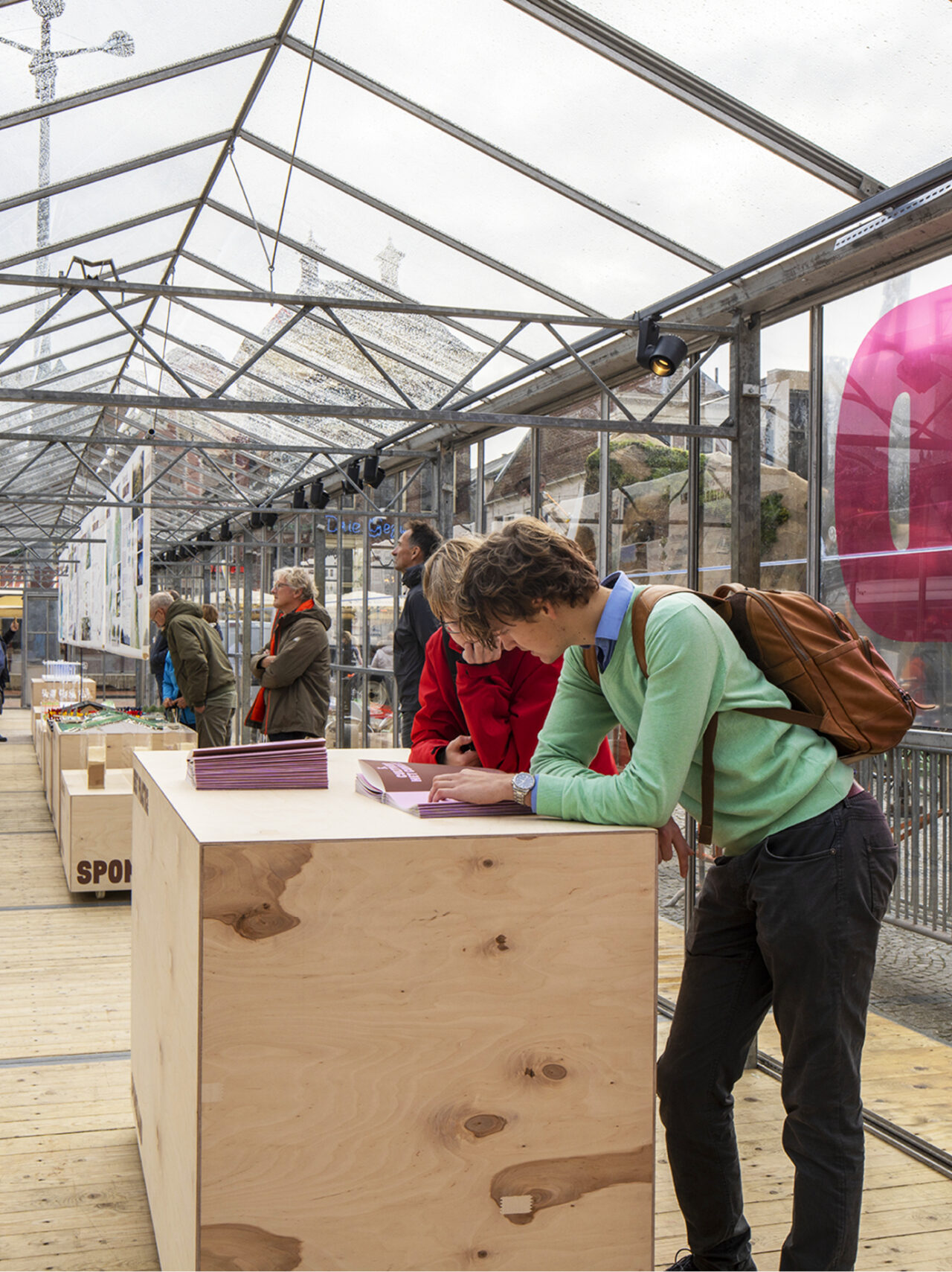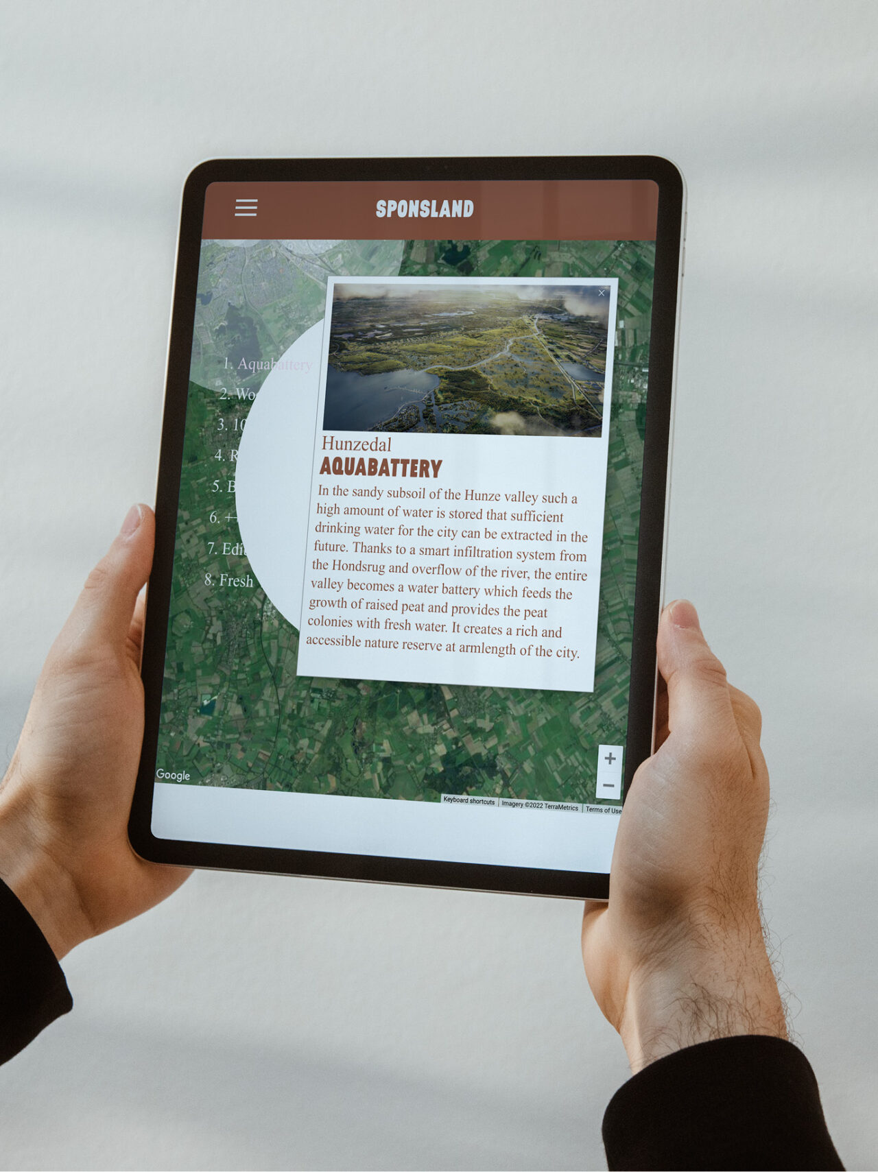 The physical exhibition was postponed to September 2021, so we decided to develop a virtual, interactive journey on the informational website of Sponsland.nl. For the virtual exhibition, we ‘hacked’ Google Street View to integrate playful 3D elements on the exact places the eight studios researched and sketched their future picture of Groningen. People could ‘travel’ in Sponsland, see the different possibilities, watch videos, and read more about each project.