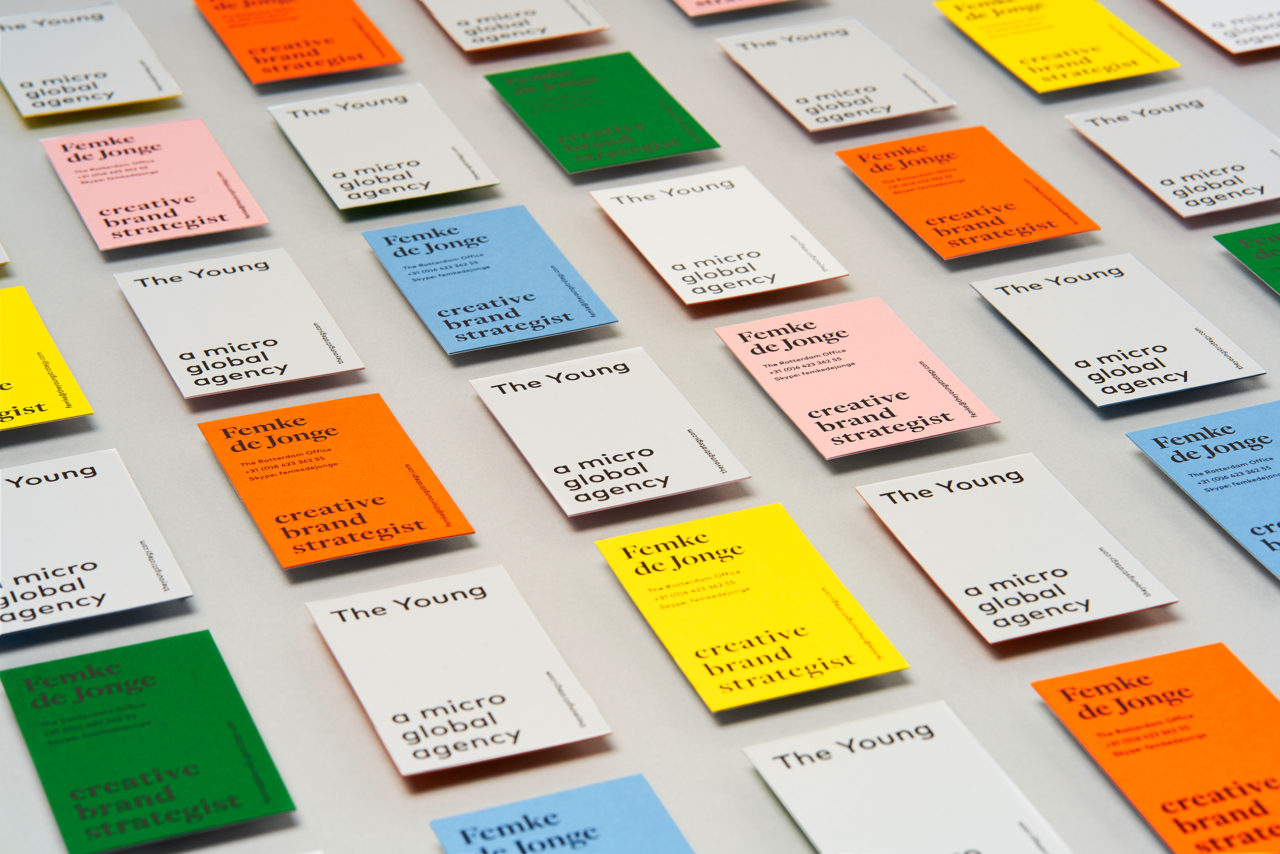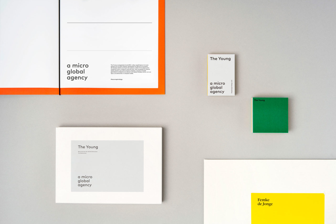 Femke de Jonge is the driving force behind The Young. We placed quotes that represent her work ethic on her correspondence in a literal way. The colour palette consists of both subtle and pronounced colours. Her correspondence can be adjusted to the profile of a client in the way an outfit can be adjusted to a certain employer. We gave the Post-It, an essential tool for workshops, its own line of colours. Even a chocolate bar, which De Jonge uses in her workshops, was incorporated in our The Young branding.