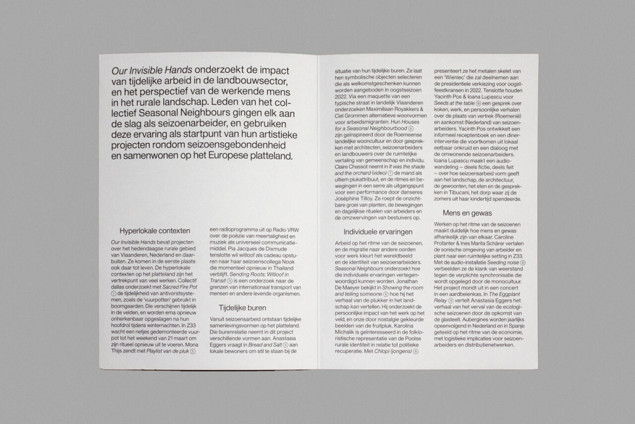 Z33 is a museum for Contemporary Art, Design & Architecture in Hasselt, Belgium. Our studio designed a new campaign identity (2022-2023), museum map and folders for their new exhibition serie.
