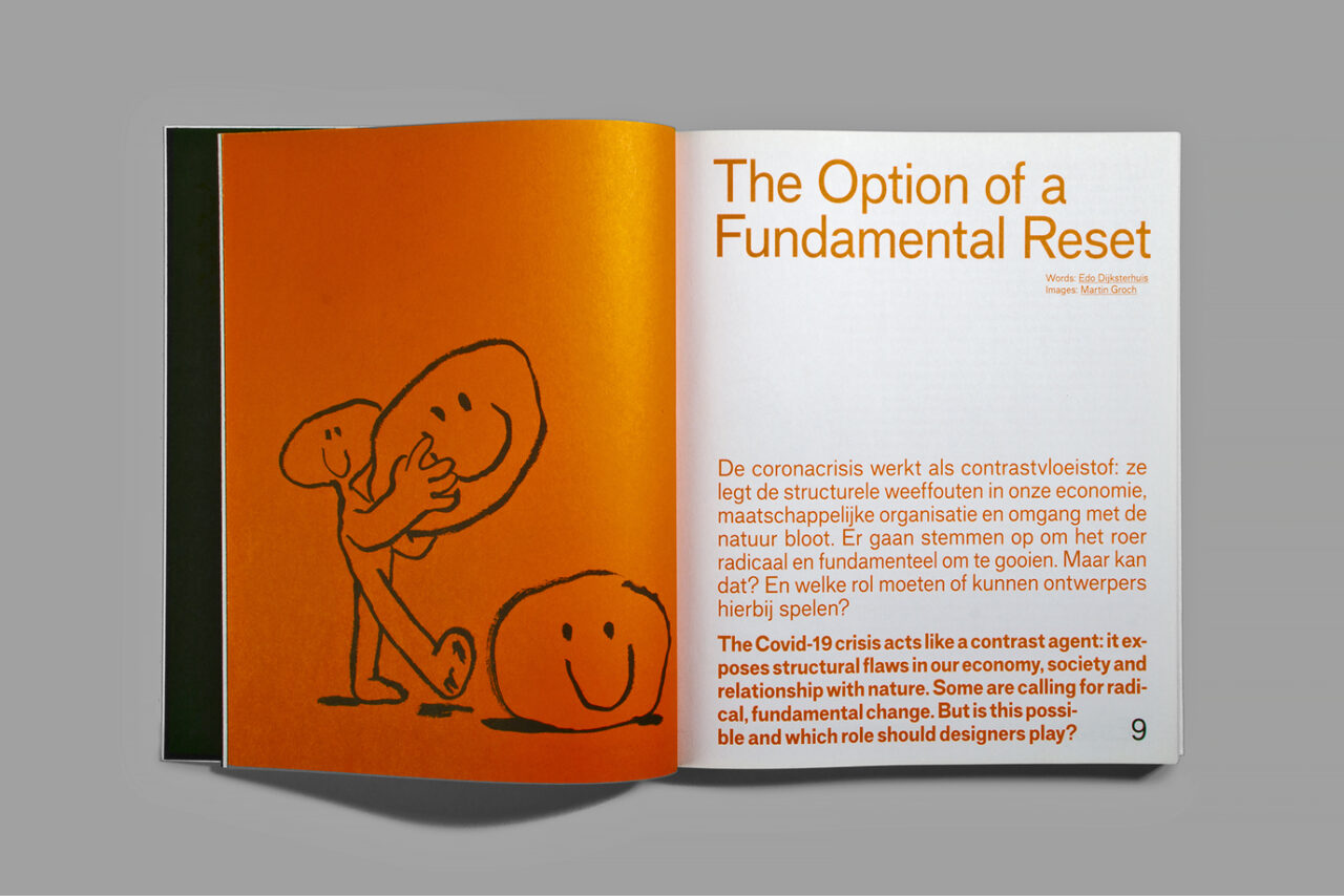 We begonnen in 2020 met Dd Magazine 0 en het Dd Yearbook ’20 onder het thema Reset. Een schone lei, een nieuw ontwerp en een nieuw lettertype voor een nieuwe serie tijdschriften en jaarboeken. Het propje papier op de cover van het jaarboek staat voor de frisse start. Om Dutch design community te benadrukken, kozen we voor een Nederlands lettertype en een oranje achtergrond.