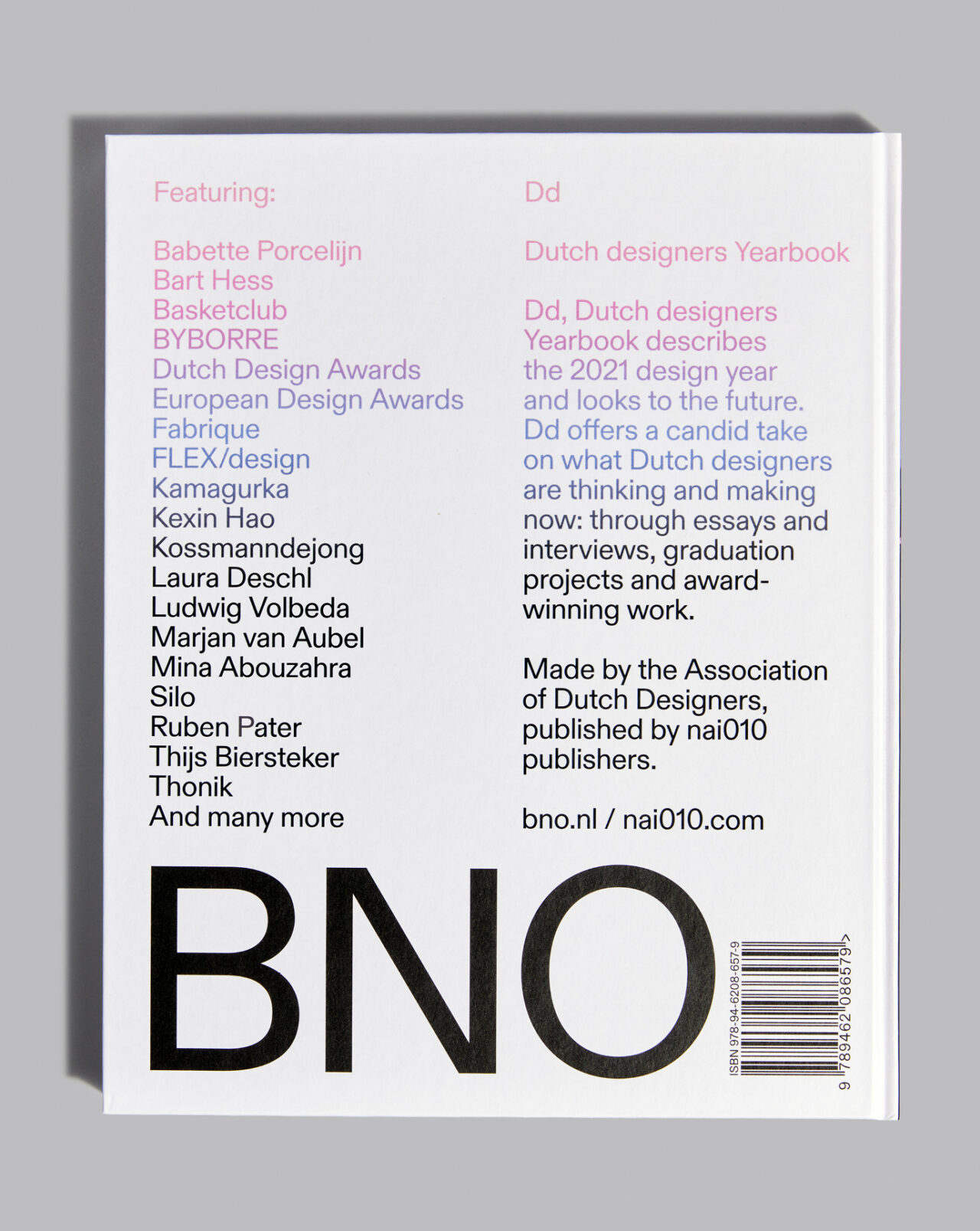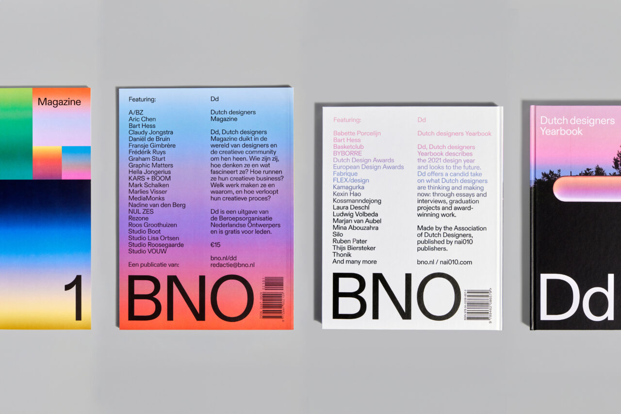De Beroepsvereniging van Nederlandse Ontwerpers (BNO) is de grootste community van ontwerpers en ontwerpbureaus in Nederland. Als onderdeel van hun visuele identiteit rebranding ontwikkelden we het Dutch designers (Dd) platform om Nederlandse design(ers) te inspireren, verbinden en vieren. Onderdeel van het Dd platform zijn de jaarlijkse publicaties Dd Magazine en Dd Yearbook. In Dd Magazine richten we ons op design en essays rondom een thema, terwijl het Jaarboek alles behandelt wat er dat jaar is gebeurd op het gebied van Nederlands design: van prijswinnaars tot aanstormend talent en werk van studenten. Zowel het ontwerp als de inhoud van deze publicaties zijn gebaseerd op een jaarlijks terugkerend, actueel thema.