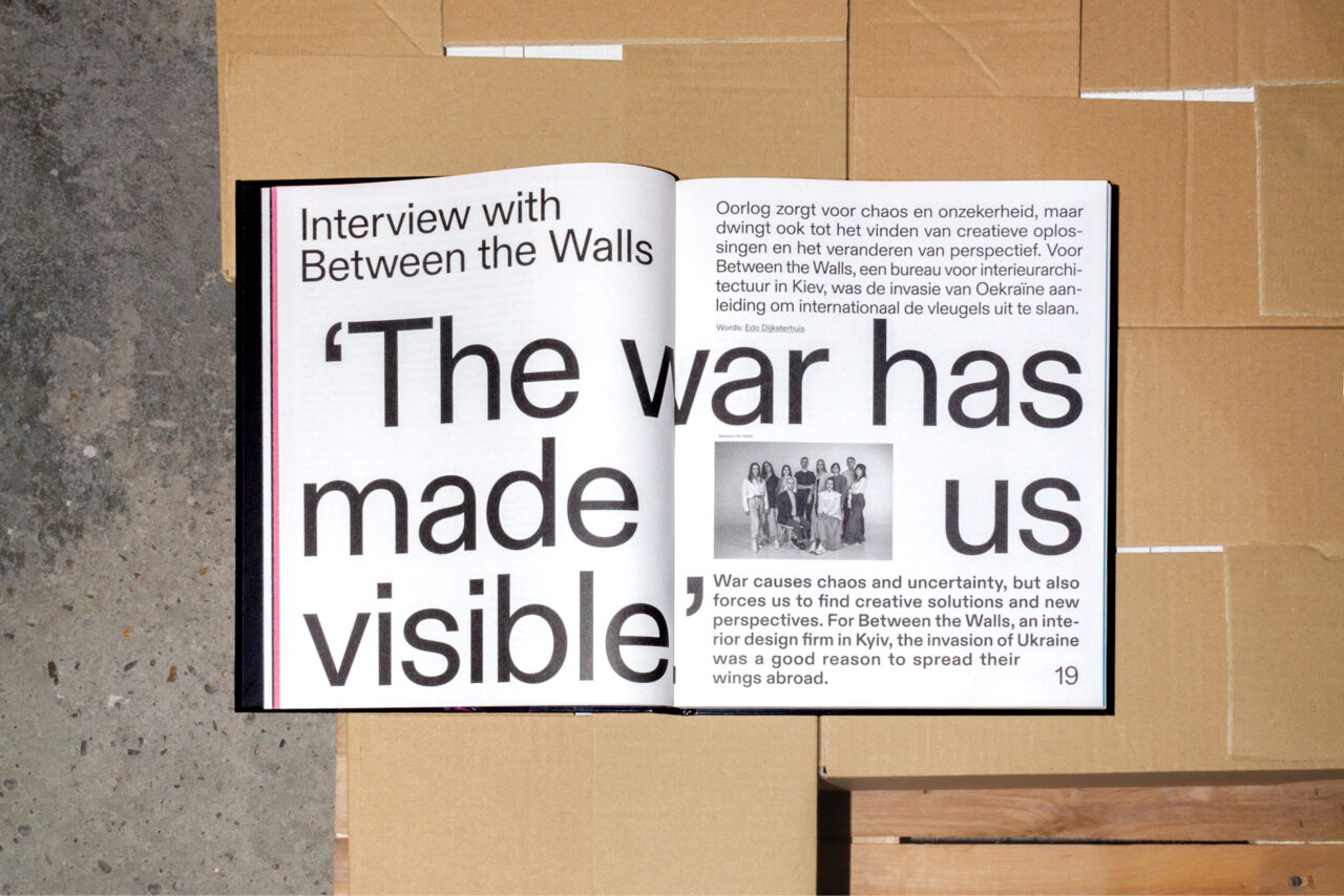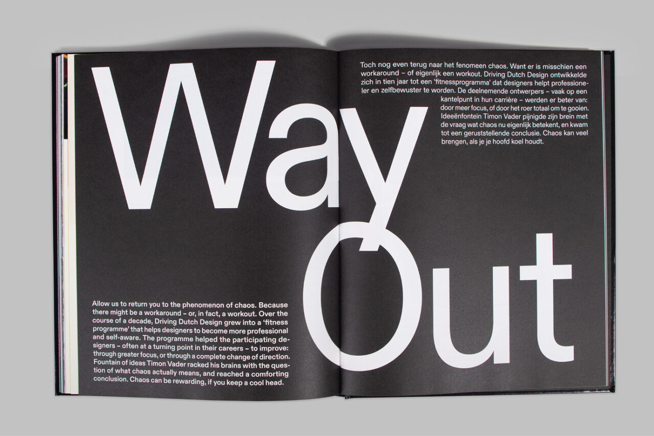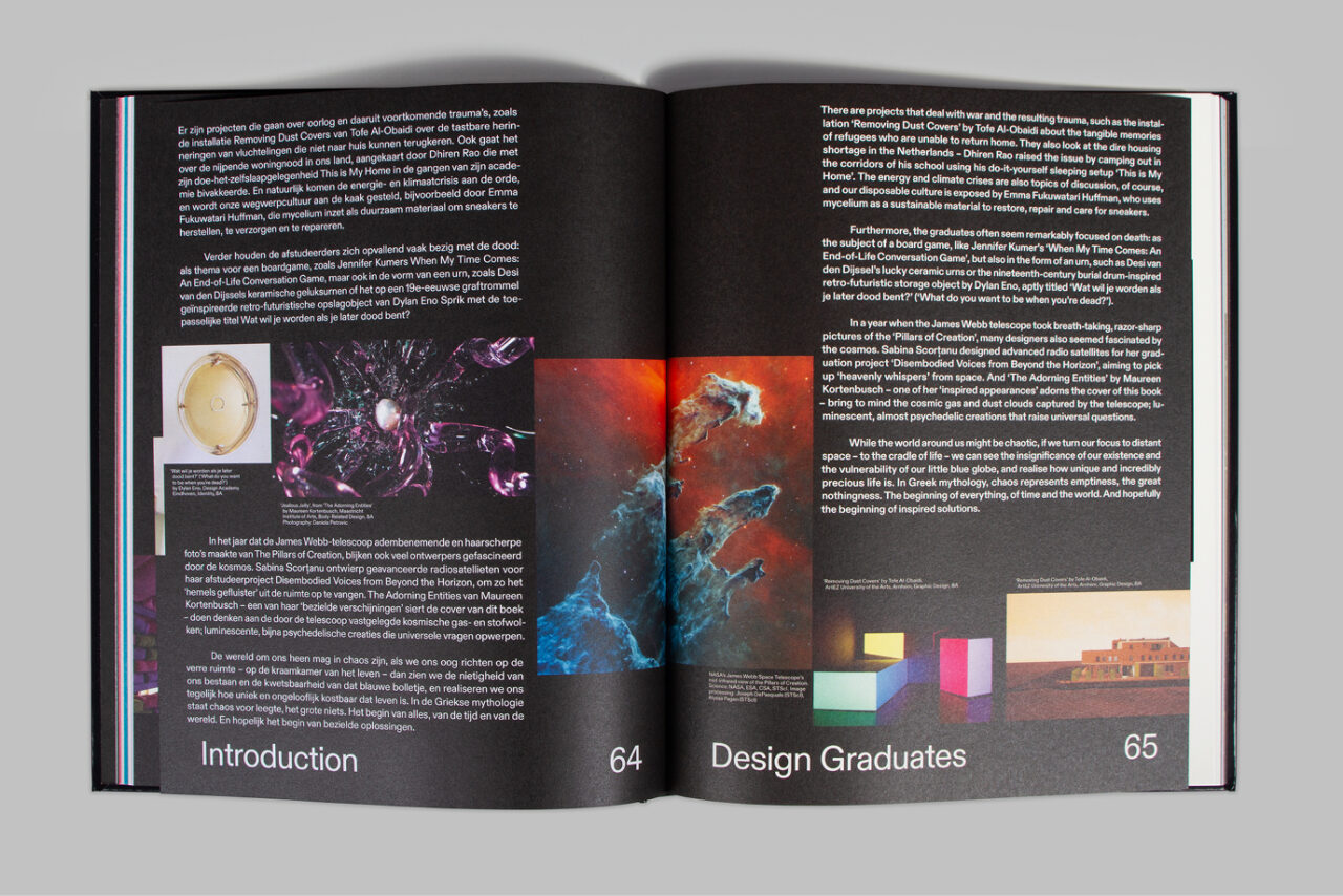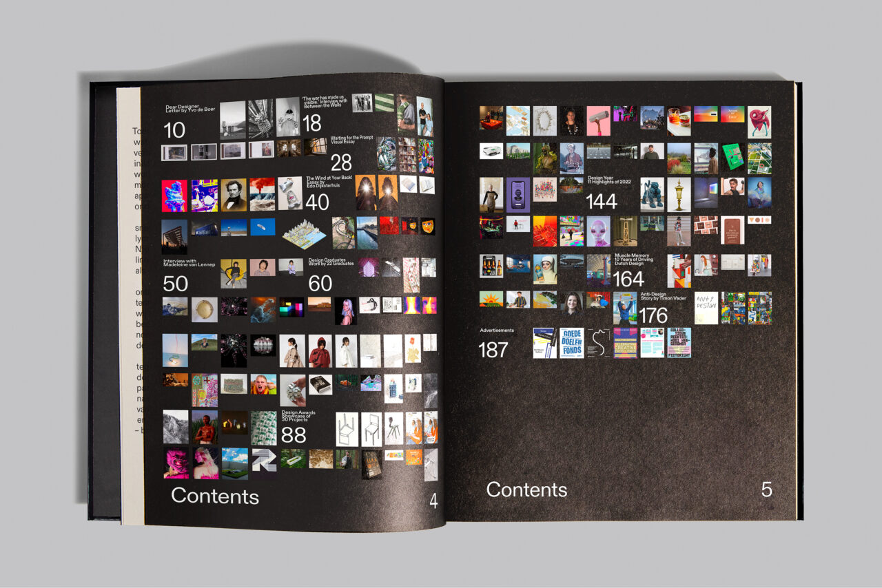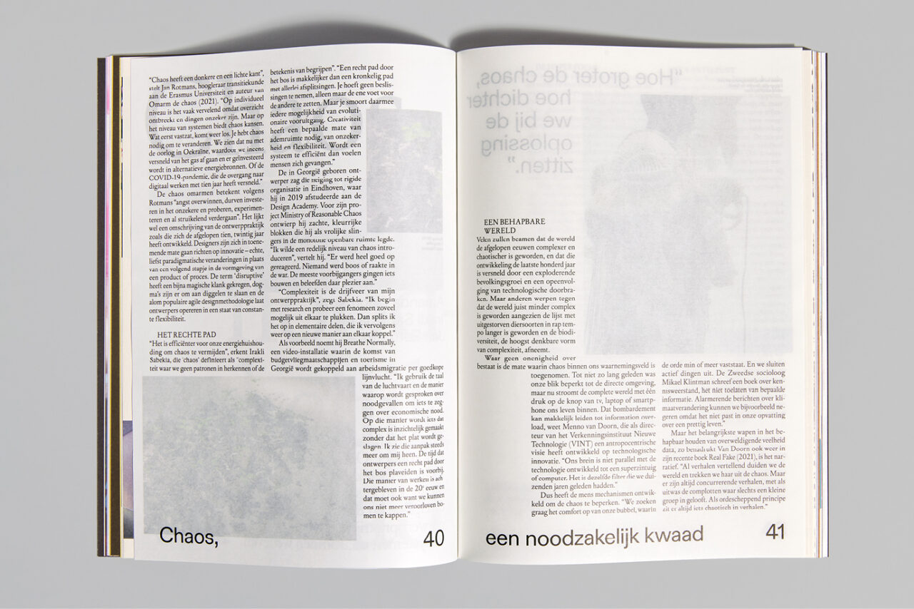 Na een turbulent jaar was het thema voor 2022 ‘Chaos’. We gebruikten de schaarste van papier als een van de ontwerpprincipes. We werkten samen met papierleverancier Igepa en gebruikten hun deadstock papier, waarbij we om de acht pagina’s wisselden tussen papier met verschillende kleuren, gewichten en afwerkingen, wat resulteerde in abrupte veranderingen en onverwachte combinaties. Hierdoor refereerden we aan de huidige ‘chaos’ in de ontwerpwereld die wordt veroorzaakt door het tekort aan papier en omarmden we de visuele warboel die hieruit voortkwam. Bovendien verlegden we de grenzen door onconventionele plaatsing van afbeeldingen en tekst, waarbij we eigenaardigheden en fouten in het ontwerp benadrukten en overdreven. Dit heeft hetzelfde conceptueel chaotische effect op het ontwerp, zonder dat het blad moeilijk leesbaar wordt.