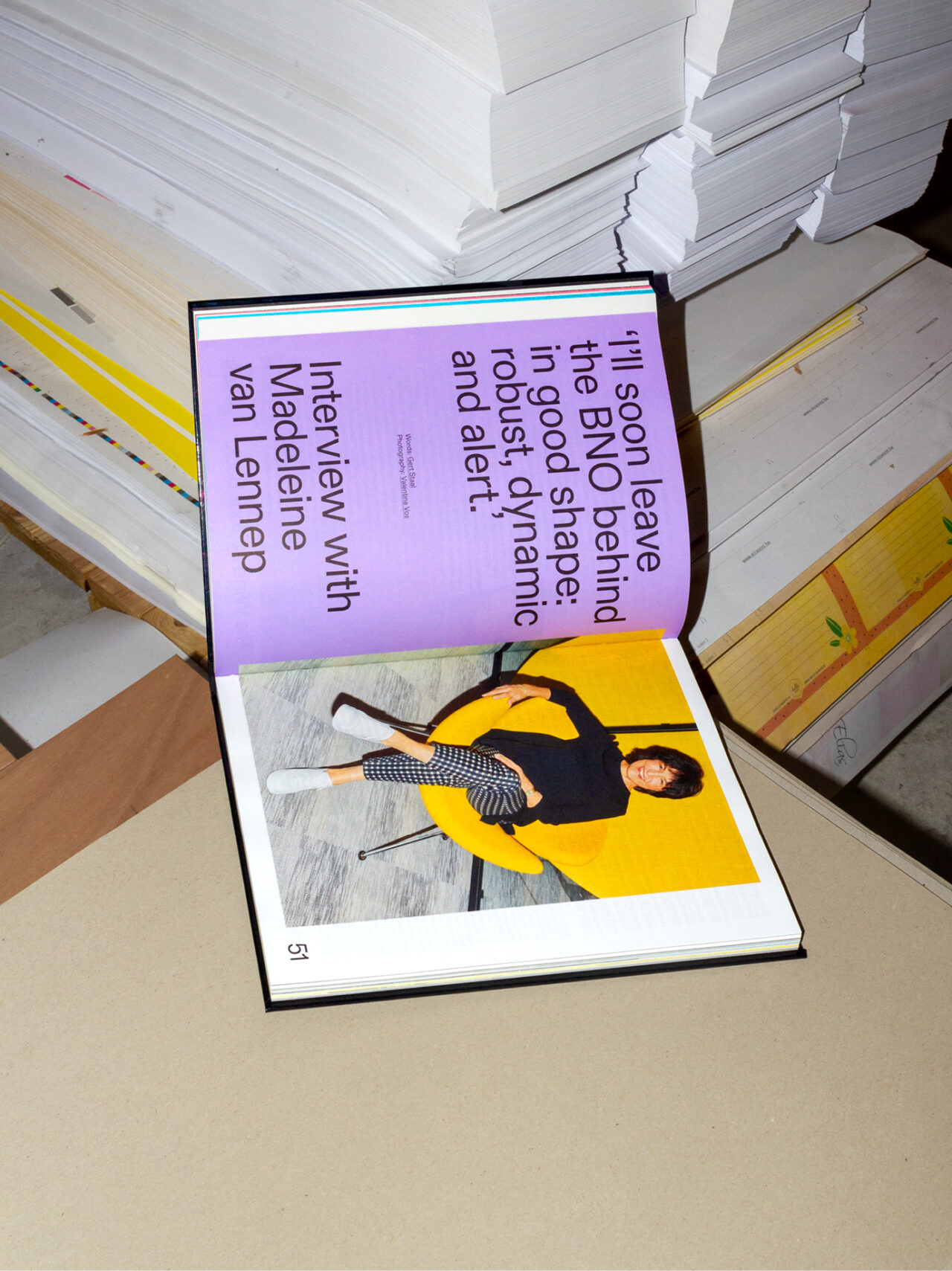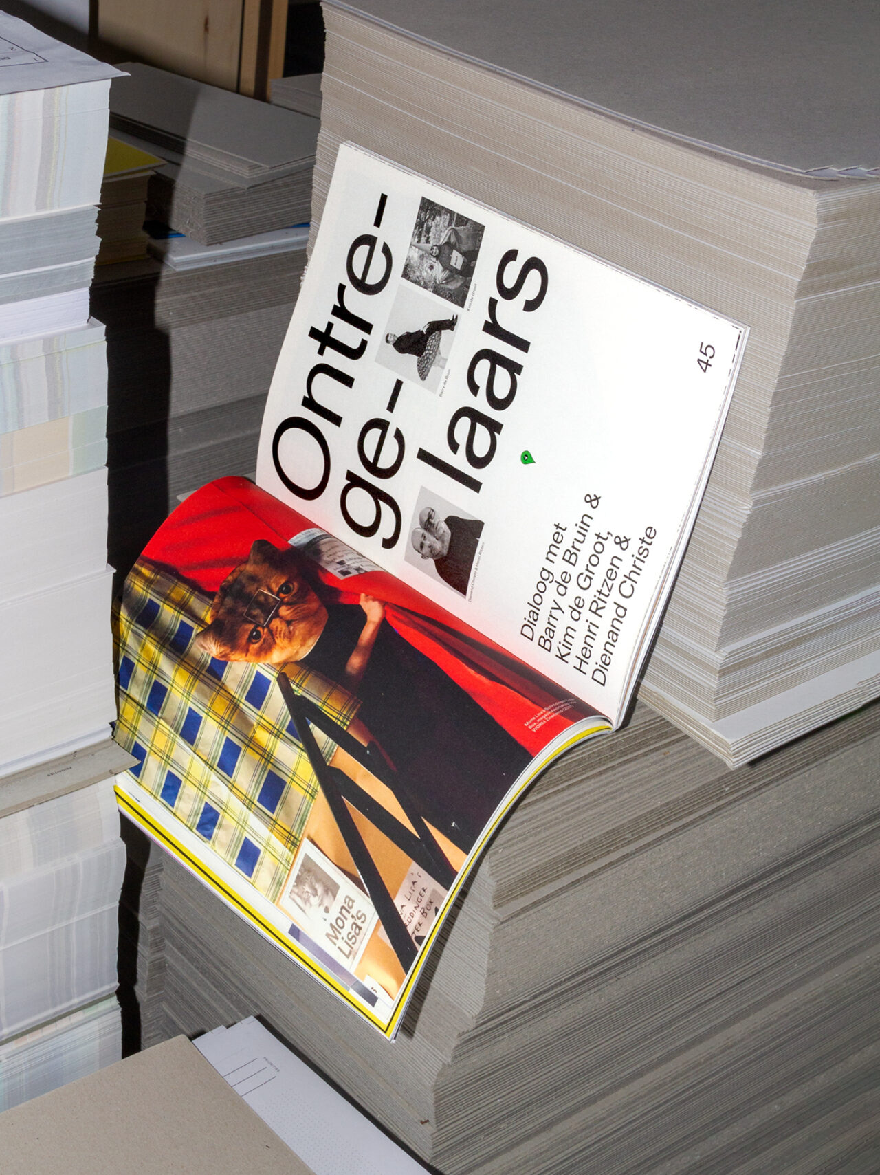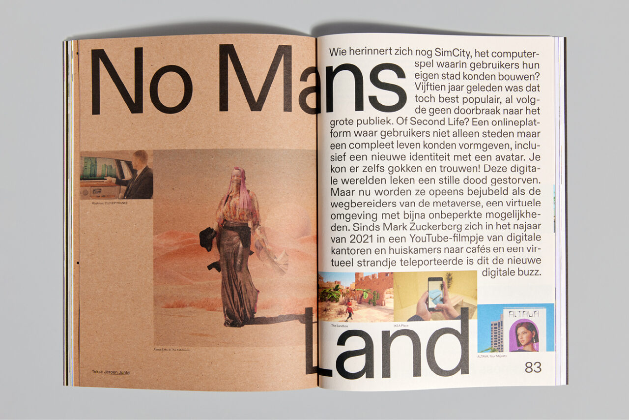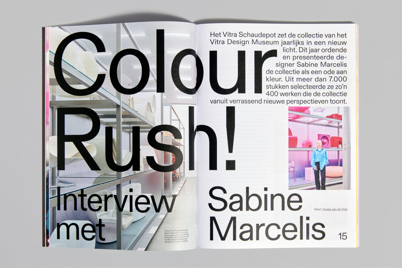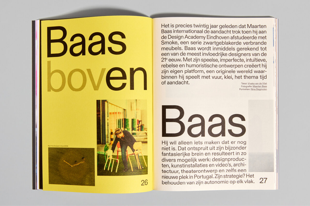 Na een turbulent jaar was het thema voor 2022 ‘Chaos’. We gebruikten de schaarste van papier als een van de ontwerpprincipes. We werkten samen met papierleverancier Igepa en gebruikten hun deadstock papier, waarbij we om de acht pagina’s wisselden tussen papier met verschillende kleuren, gewichten en afwerkingen, wat resulteerde in abrupte veranderingen en onverwachte combinaties. Hierdoor refereerden we aan de huidige ‘chaos’ in de ontwerpwereld die wordt veroorzaakt door het tekort aan papier en omarmden we de visuele warboel die hieruit voortkwam. Bovendien verlegden we de grenzen door onconventionele plaatsing van afbeeldingen en tekst, waarbij we eigenaardigheden en fouten in het ontwerp benadrukten en overdreven. Dit heeft hetzelfde conceptueel chaotische effect op het ontwerp, zonder dat het blad moeilijk leesbaar wordt.