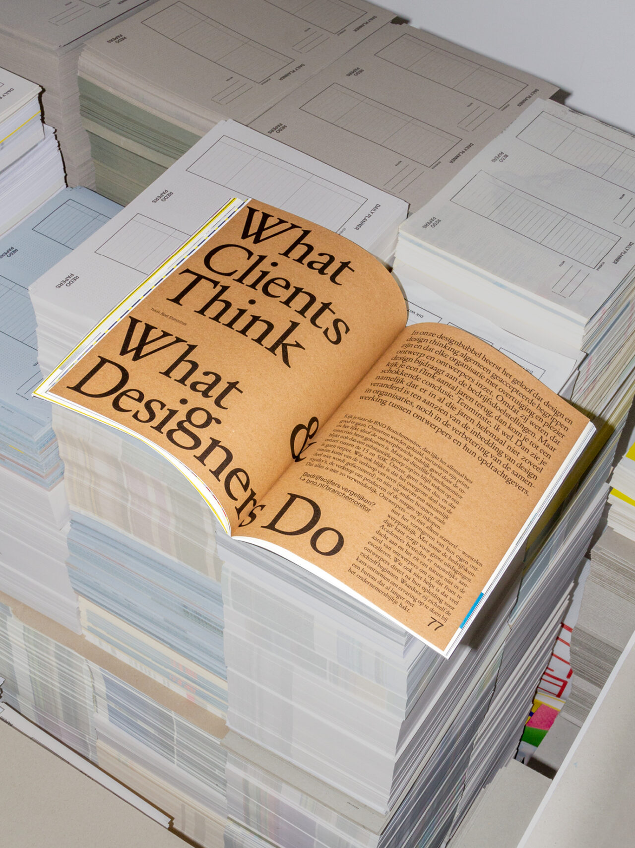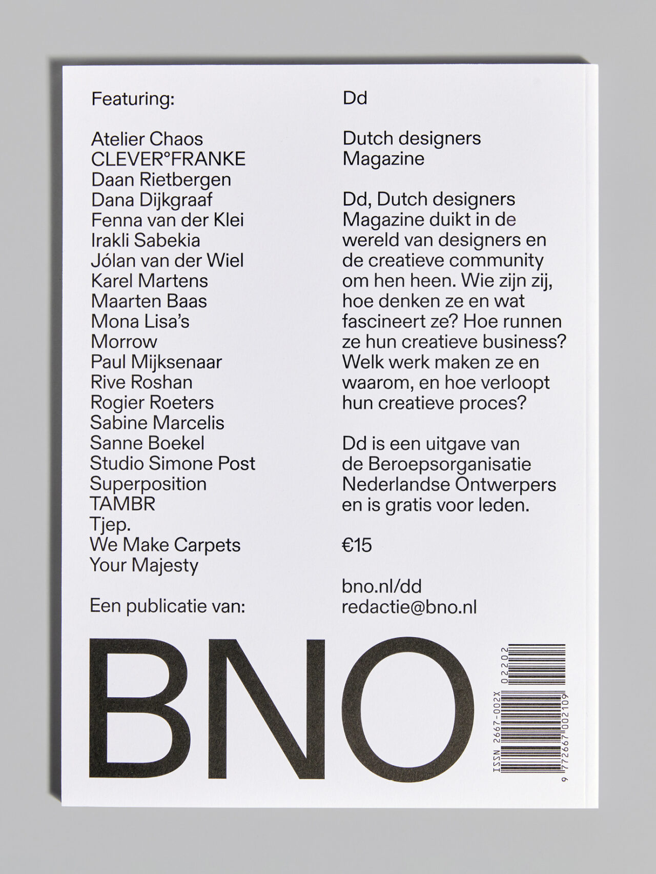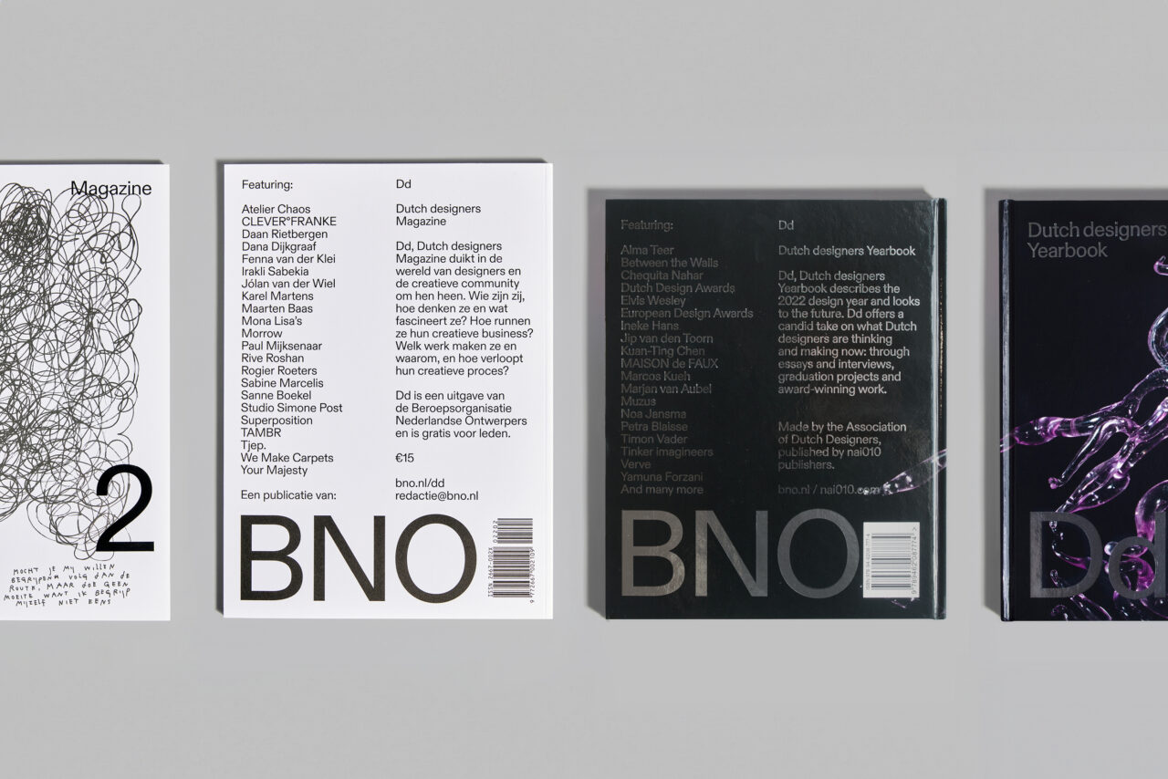 De Beroepsvereniging van Nederlandse Ontwerpers (BNO) is de grootste community van ontwerpers en ontwerpbureaus in Nederland. Als onderdeel van hun visuele identiteit rebranding ontwikkelden we het Dutch designers (Dd) platform om Nederlandse design(ers) te inspireren, verbinden en vieren. Onderdeel van het Dd platform zijn de jaarlijkse publicaties Dd Magazine en Dd Yearbook. In Dd Magazine richten we ons op design en essays rondom een thema, terwijl het Jaarboek alles behandelt wat er dat jaar is gebeurd op het gebied van Nederlands design: van prijswinnaars tot aanstormend talent en werk van studenten. Zowel het ontwerp als de inhoud van deze publicaties zijn gebaseerd op een jaarlijks terugkerend, actueel thema.