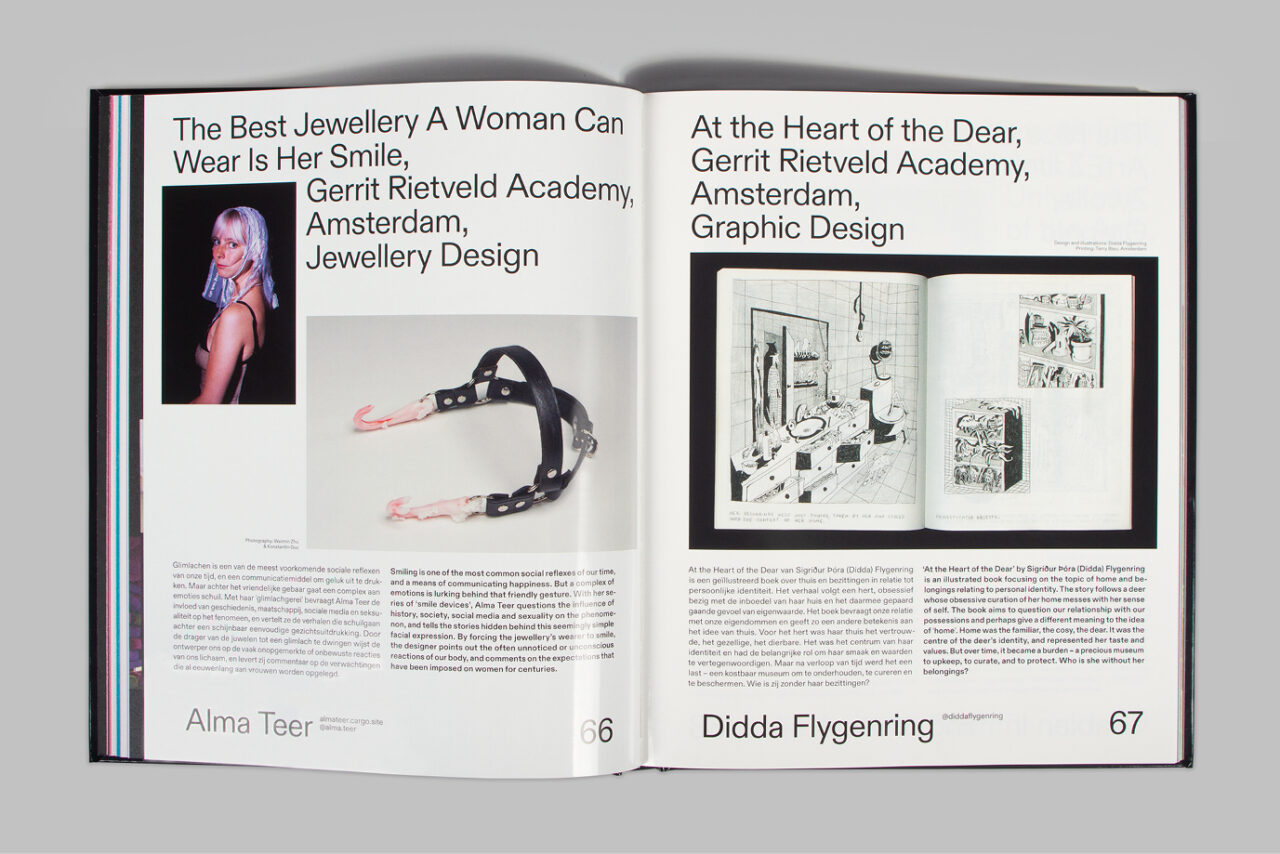 Voor elke publicatie vragen we een andere ontwerper voor de cover. Dd Magazine 2 was voorzien van een illustratie van Rogier Roeters. In het ’21 Yearbook prijkte het afstudeerproject The Adorning Entities van Maureen Kortenbusch. Door deze publicaties en de betrokkenheid van de community is de BNO een merk geworden voor, met en gemaakt door Nederlandse ontwerpers.