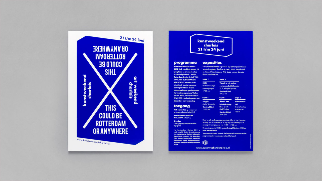 In de wijk Charlois wonen en werken circa 300 kunstenaars. Het is een hechte, internationale kunstenaarsgemeenschap. Met ‘This Could Be Rotterdam Or Anywhere’ wilde het Kunstweekend Charlois dit bijzondere gebied in Rotterdam-Zuid op de kaart zetten, ook voor mensen aan de overkant van de Maas. Meer dan 100 kunstenaars toonden hun werk op bijzondere locaties in het havengebied van Charlois: van leegstaande winkels en ateliers tot woonkamers, galeries en binnentuinen. Ook bood de manifestatie een randprogramma met workshops, concerten, feesten en films.