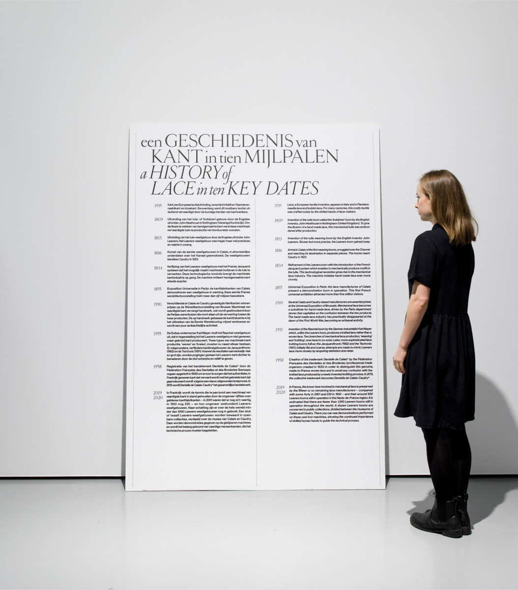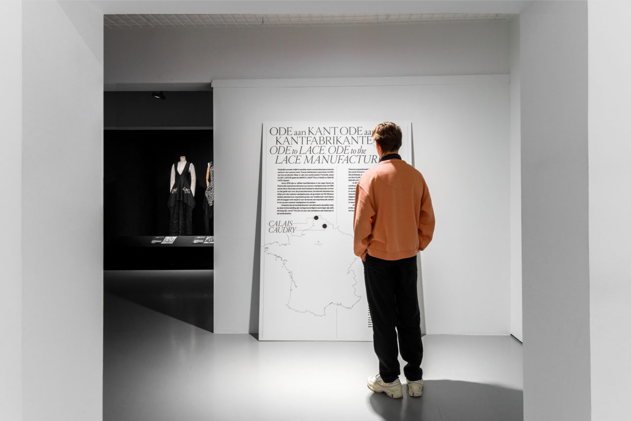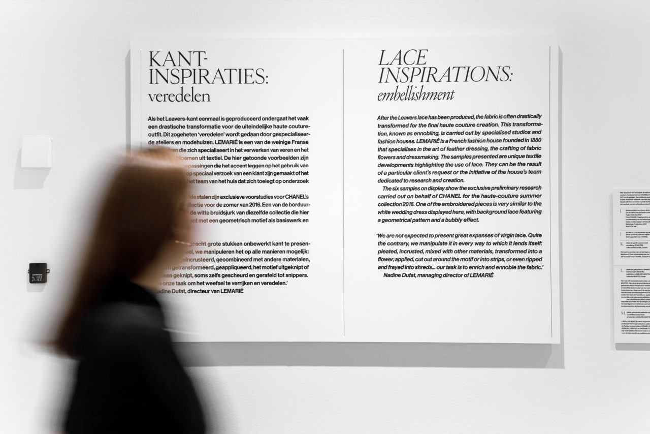 Voor het ontwerp van de tentoonstelling lieten we ons inspireren door de unieke structuren, vormen en fijnheid van kant en de iconische typografie uit klassieke Franse modetijdschriften zoals de Vogue. De typische sierlijke schreefletters, kleine afstanden en herhaling van woorden uit de tijdschriften vind je terug als een weefstructuur in het ontwerp en de belettering van de tentoonstelling. Het ontwerp van de tentoonstelling licht de prachtige haute-couture-stukken uit en geeft met de grafische laag een tweede betekenis aan het gevoel van kant.