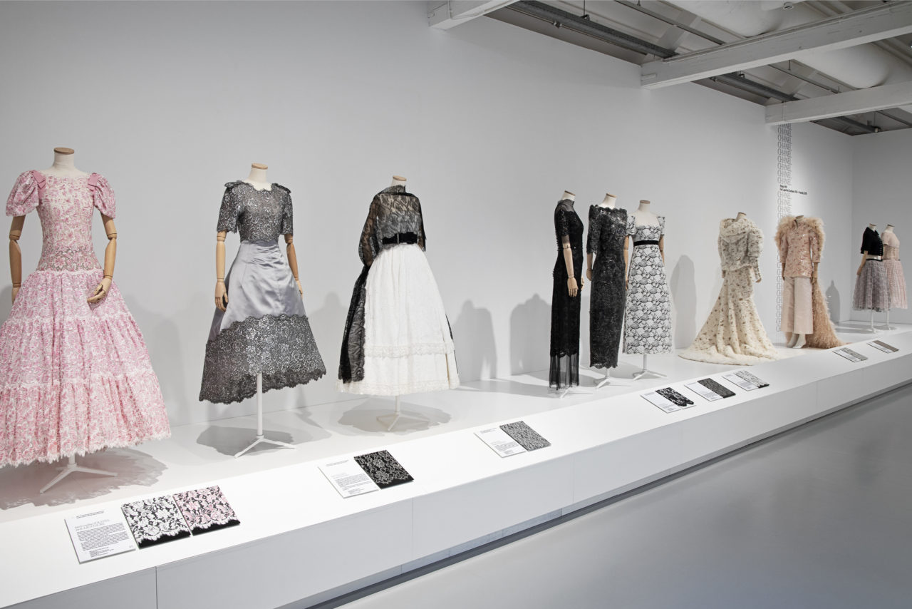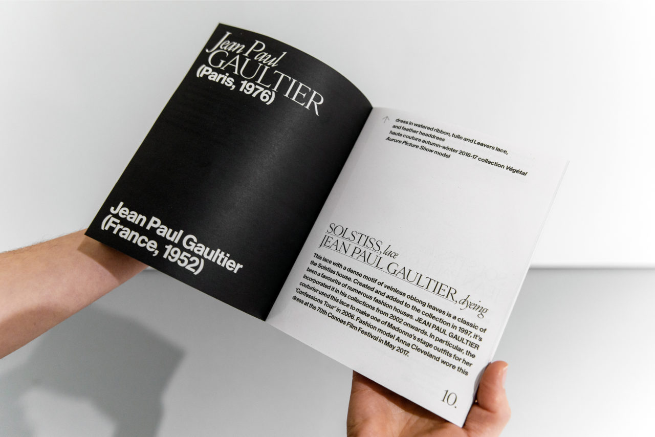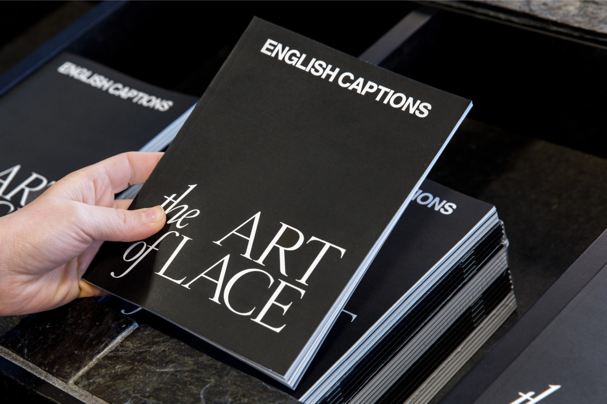 Voor het ontwerp van de tentoonstelling lieten we ons inspireren door de unieke structuren, vormen en fijnheid van kant en de iconische typografie uit klassieke Franse modetijdschriften zoals de Vogue. De typische sierlijke schreefletters, kleine afstanden en herhaling van woorden uit de tijdschriften vind je terug als een weefstructuur in het ontwerp en de belettering van de tentoonstelling. Het ontwerp van de tentoonstelling licht de prachtige haute-couture-stukken uit en geeft met de grafische laag een tweede betekenis aan het gevoel van kant.