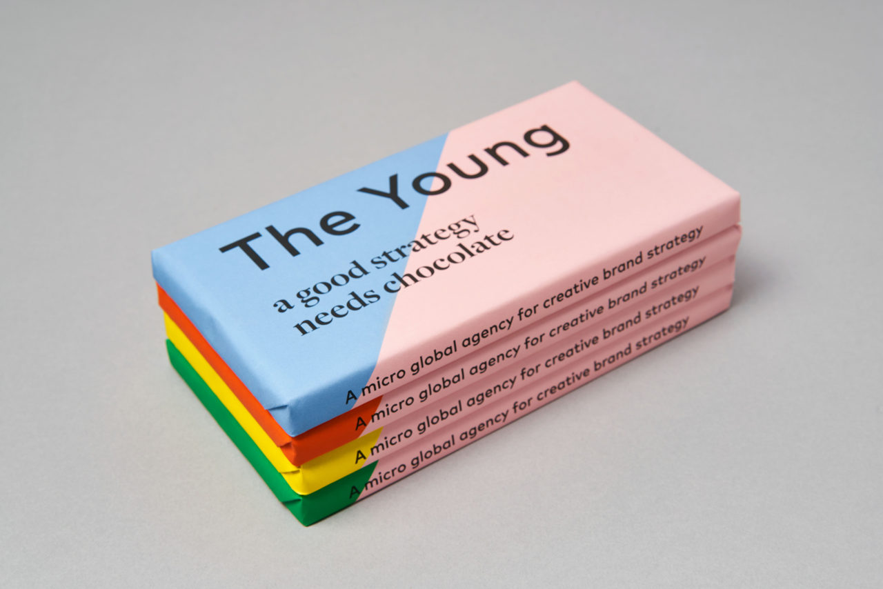 Femke de Jonge is de drijvende kracht achter The Young. We plaatsten quotes die haar arbeidsethos verwoorden op een letterlijke manier op haar correspondentie. Het kleurenpalet bestaat uit zowel uitgesproken als rustige kleuren. Zoals je de juiste outfit kiest voor een bepaalde opdrachtgever, zo is ook haar correspondentie af te stemmen op het profiel van de klant. We gaven de post-it, onmisbaar voor het geven van workshops, hun eigen kleurlijn. Zelfs een chocoladereep, die ze gebruikt in haar workshops, namen we op in het ontwerp.