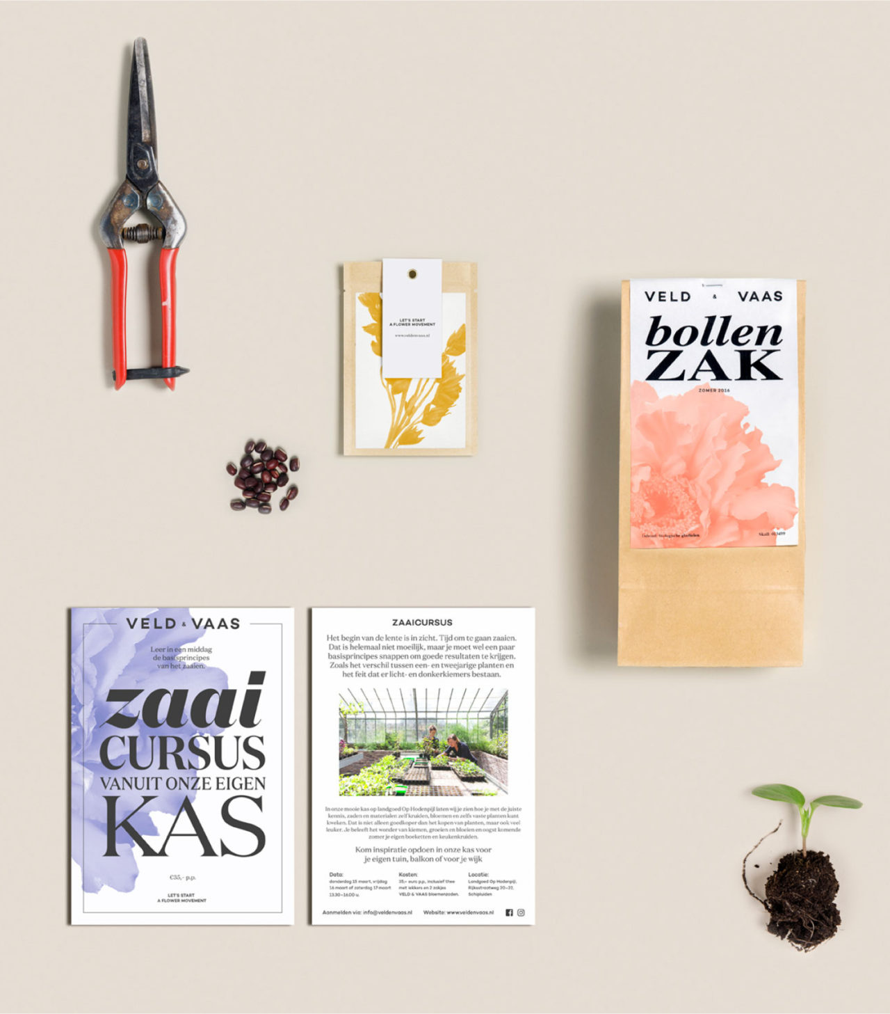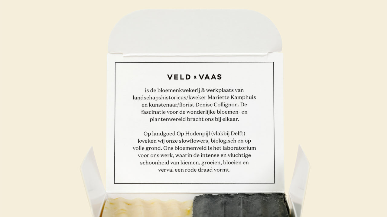 Veld & Vaas is de bloemenkwekerij en werkplaats van kweker en landschapshistoricus Mariette Kamphuis en kunstenaar en florist Denise Collignon. In hun werk staat de intense en vluchtige schoonheid van kiemen, groeien, bloeien en verval centraal. Veld & Vaas is een symbiose van twee persoonlijkheden en twee werelden: kunst en landschap. Die kenmerken vormden het uitgangspunt voor het logo en de identiteit die we voor ze ontwikkelden.
